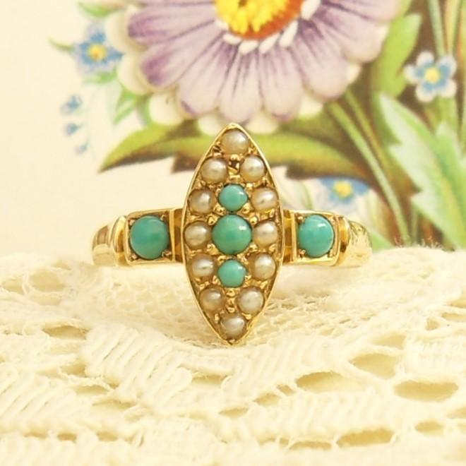 Victorian 18ct Gold Turquoise & Seed Pearl Ring Size M
