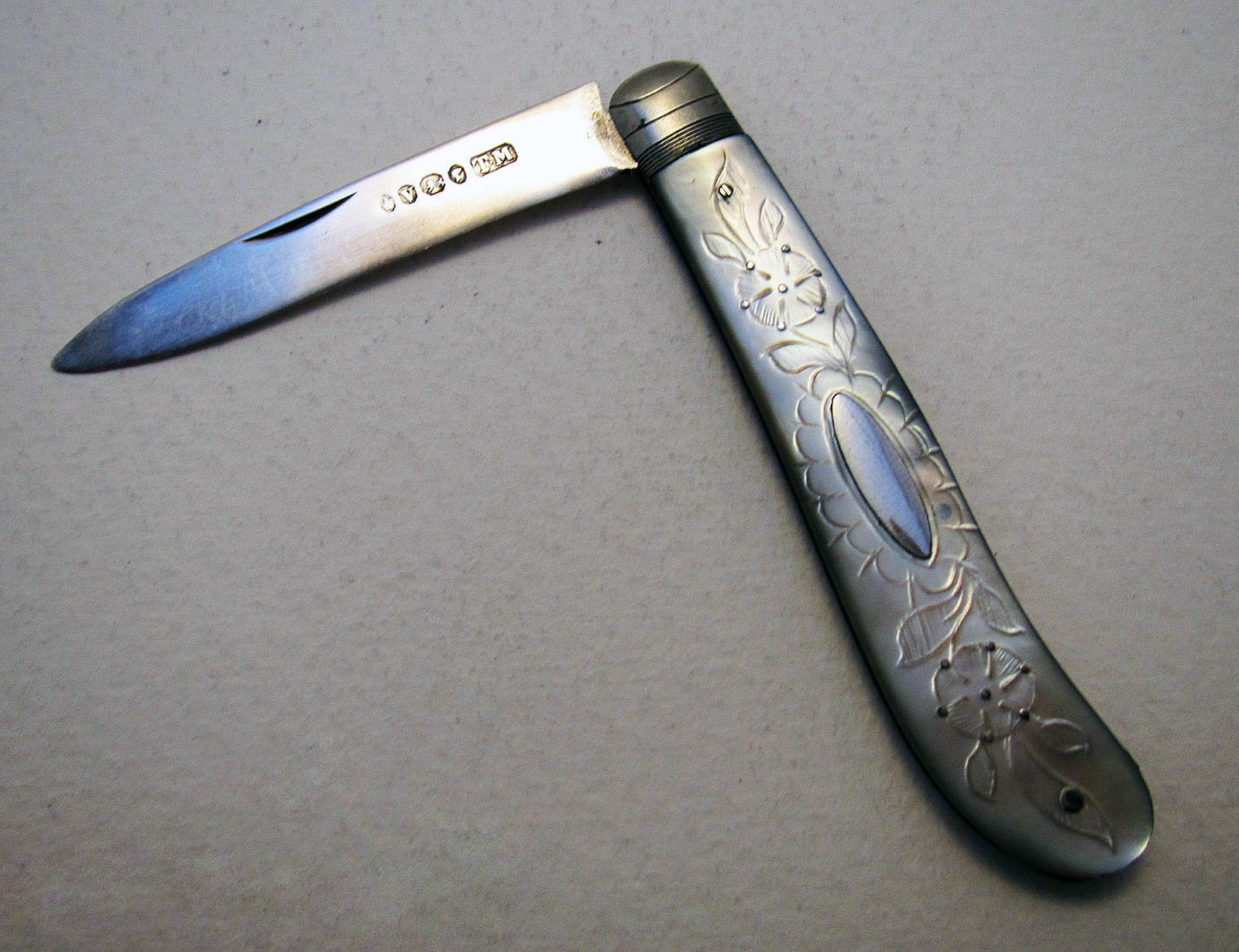 Victorian 19th Century Solid Sterling Silver & Mother of Pearl Mop English Antique Folding Pocket Fruit Penknife 1863