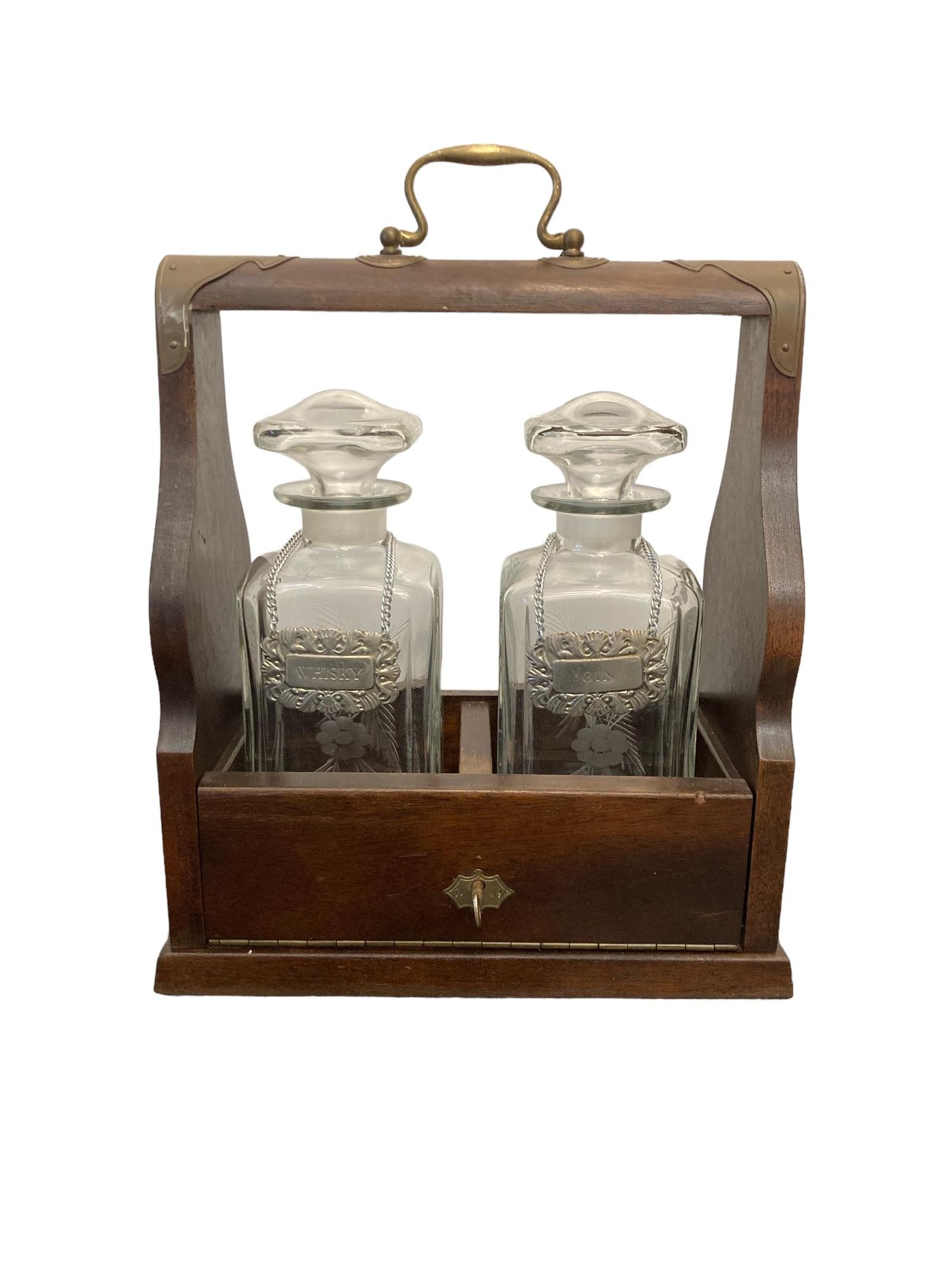 Victorian 2 Decanter Tantalus With Key, Whiskey and Gin