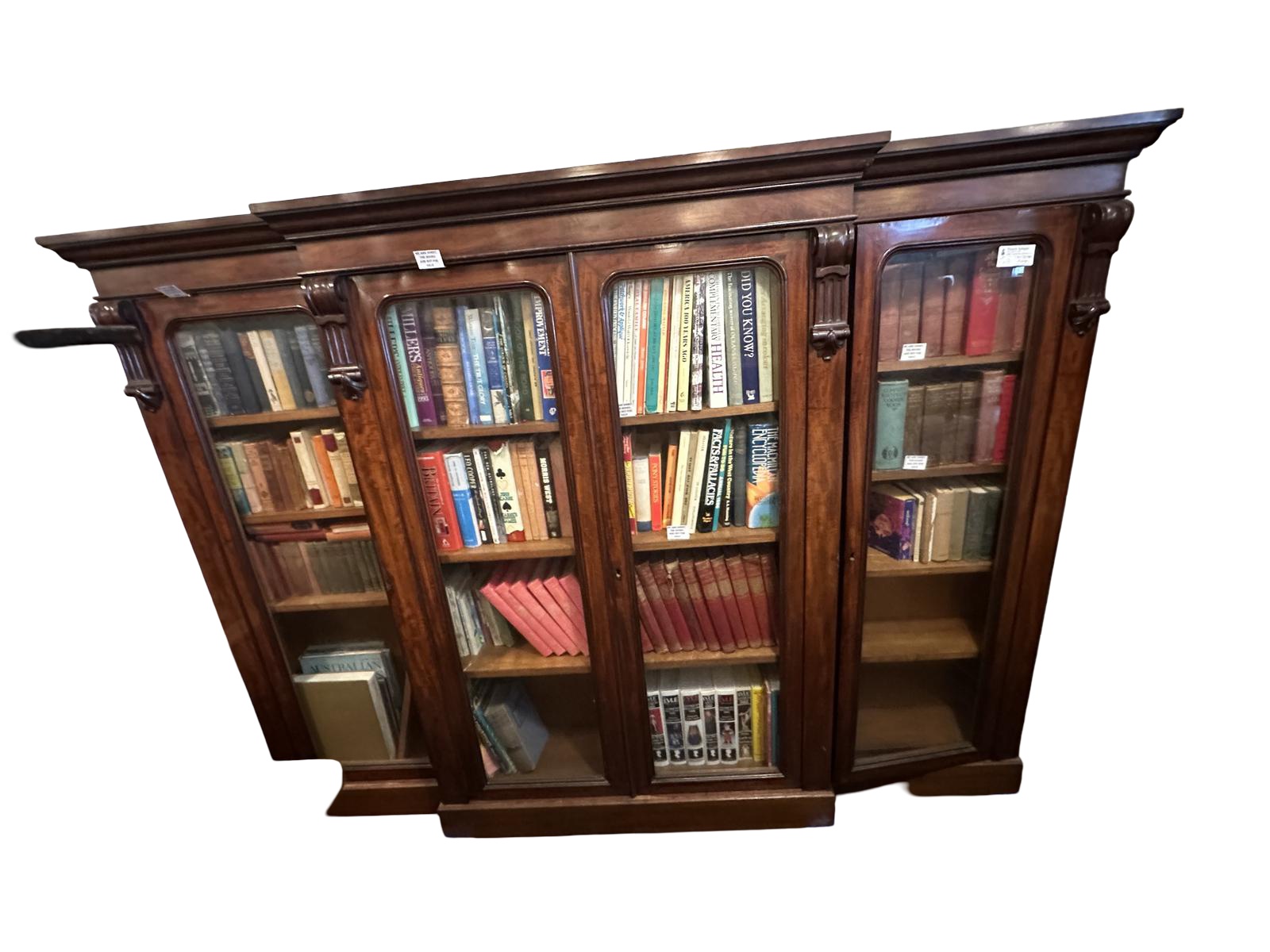 19th century Victorian 4 door break front bookcase with shaped cornice and standing on a raised plinth. Inside are fully adjustable shelves and the whole piece comes into 5 sections for easy transportation and installation.