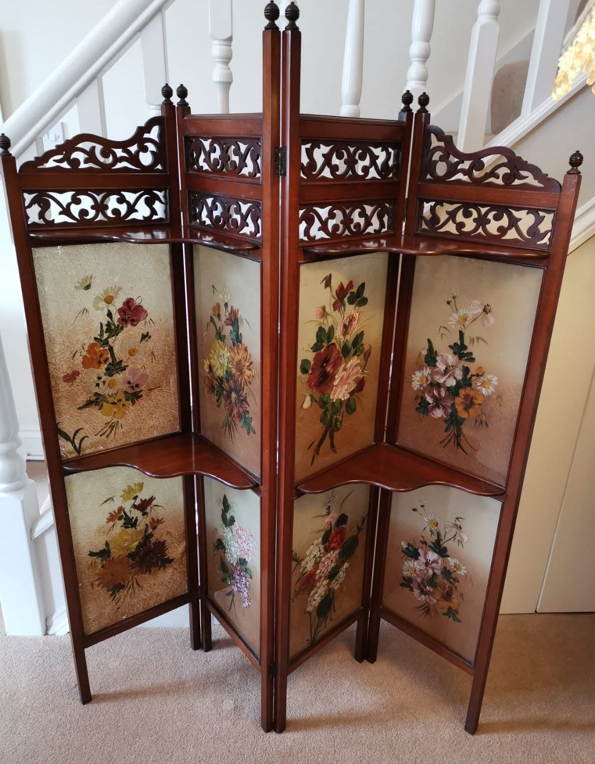 Victorian 4 Panel Mahogany Room Screen with 8 Hand Painted Panels