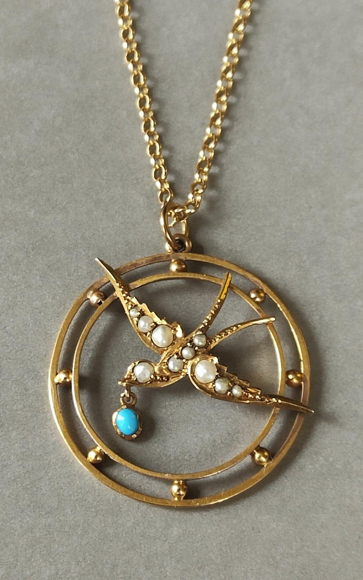 Victorian 9ct Gold Turquoise Swallow Pendant Necklace (1 of 9)