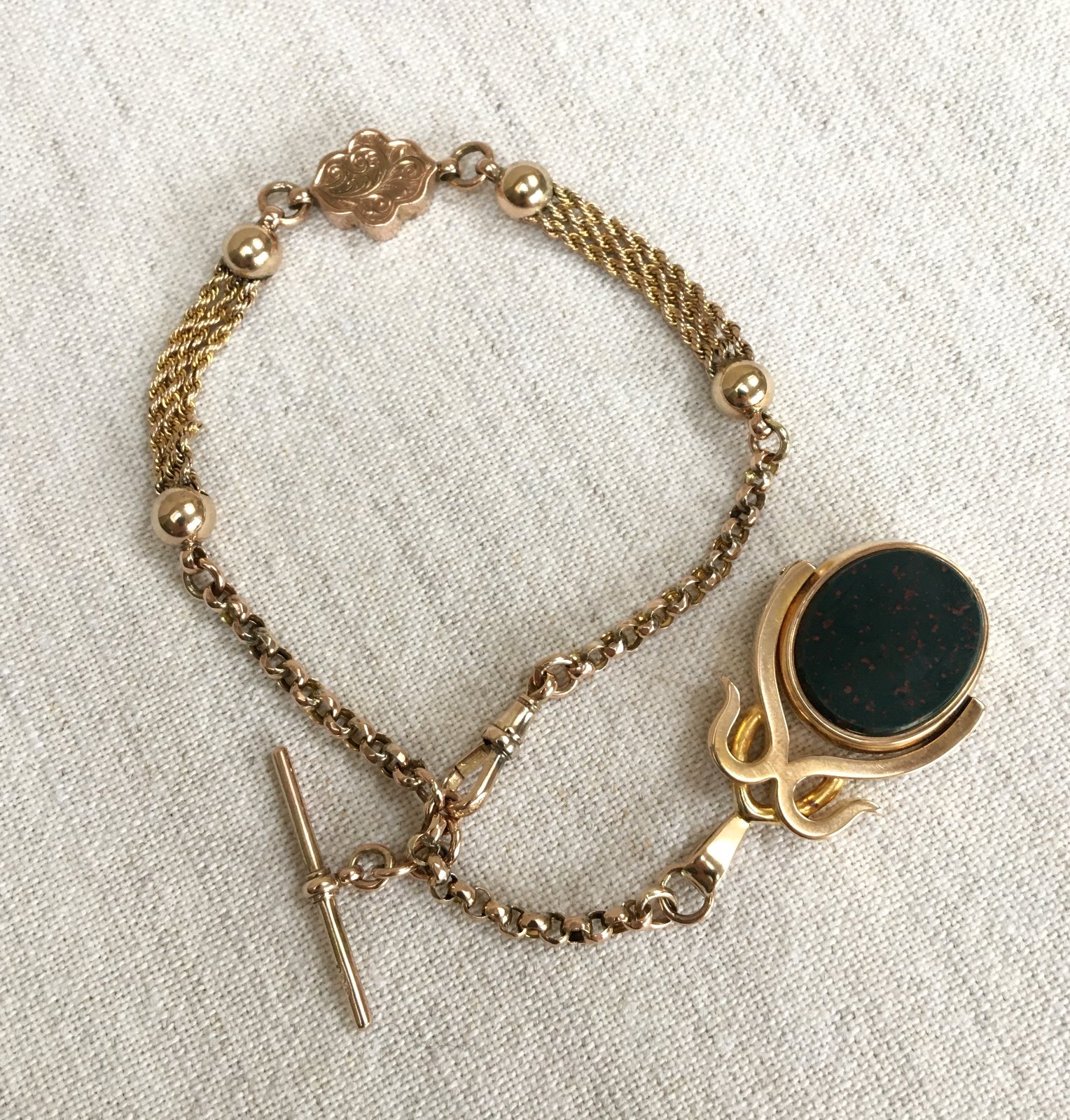 Victorian 9ct Rose Gold Albertina Bracelet with 15ct Bloodstone & Agate Swivel Fob