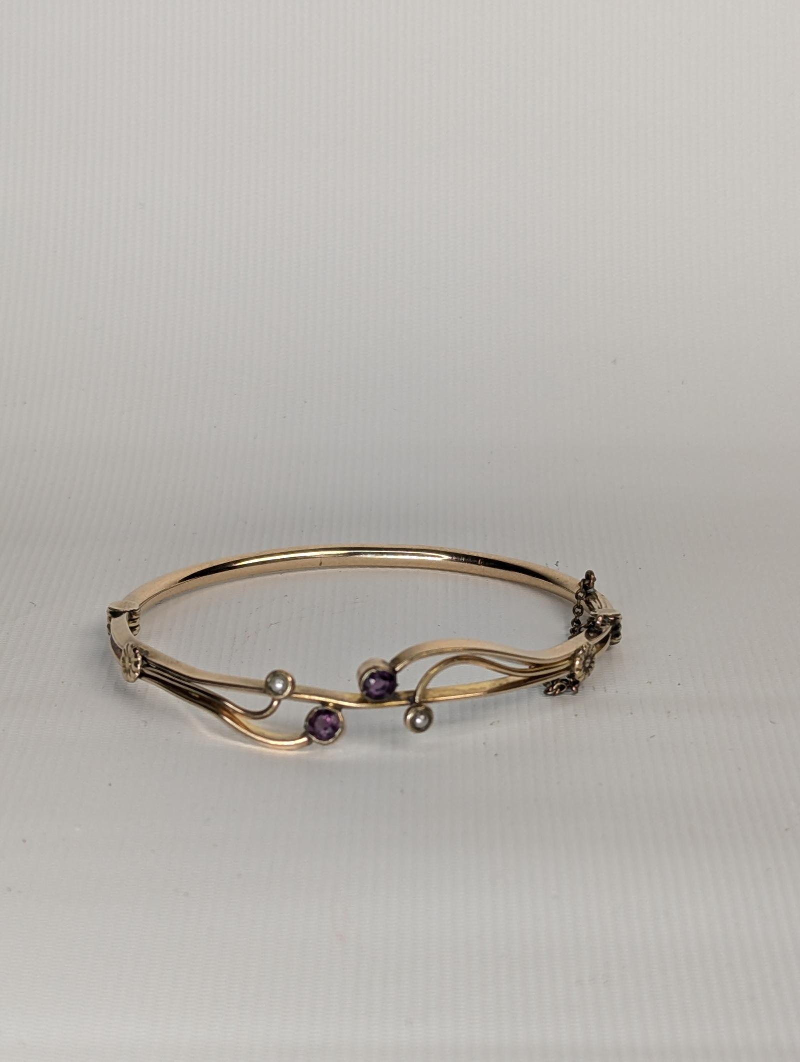 This Victorian bangle is crafted from rolled gold and features amethyst stones along with seed pearls. The design reflects the aesthetic characteristics typical of the late Victorian era. The item is a notable example of jewellery from this period, highlighting the use of gemstones and delicate embellishments. A safety chain is attached for added security and a few stamps are present on the inner side of the bangle. 1/10 stamp to indicate rolled gold.
