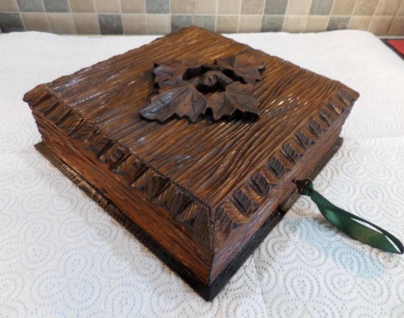 Victorian Antique 19th Century Black Forest Hand Carved Box- Lovely Relined Interior - Lock & Key