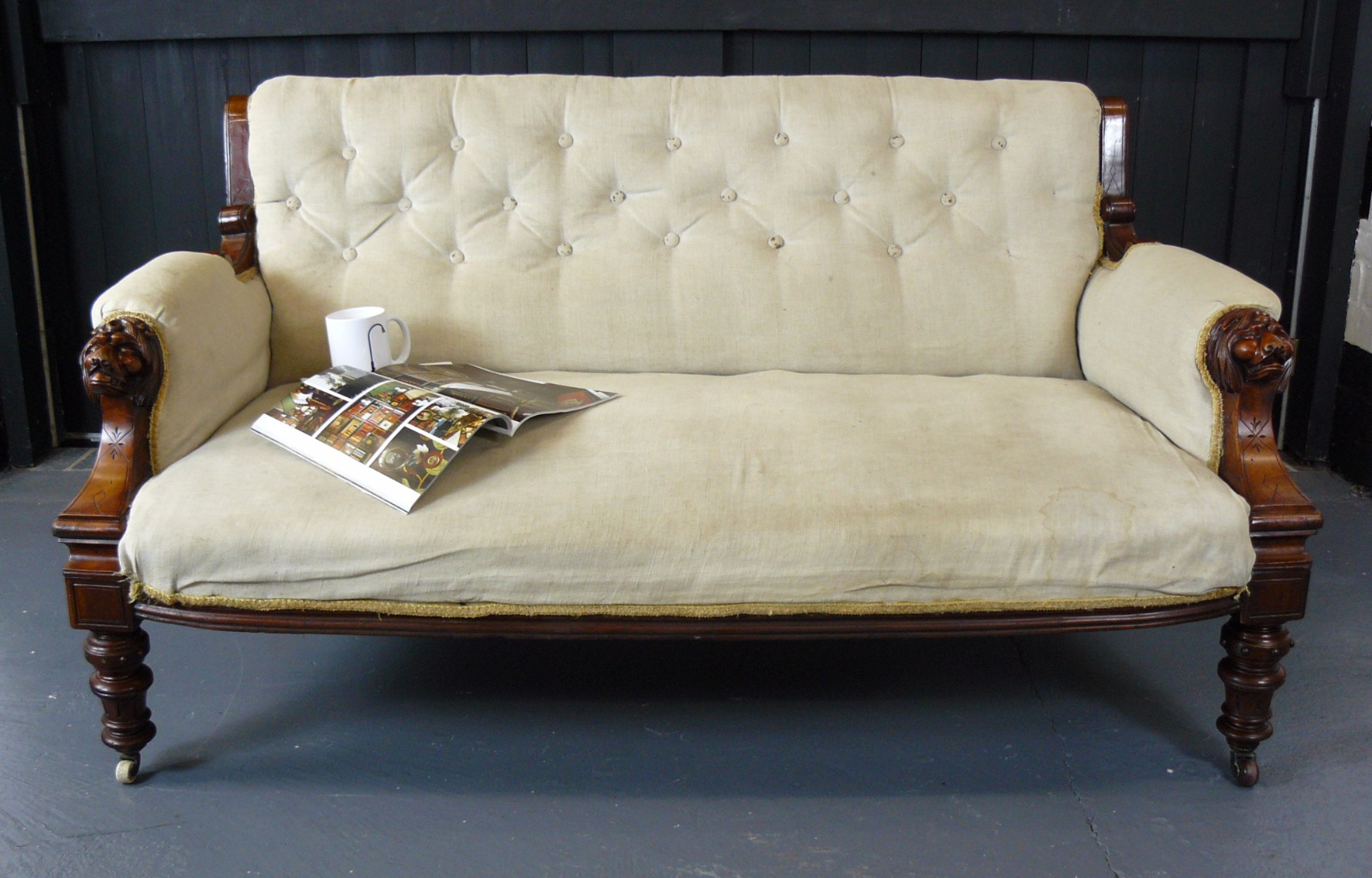 Victorian Antique Mahogany Framed Two Seater Sofa With Lions Head Arms