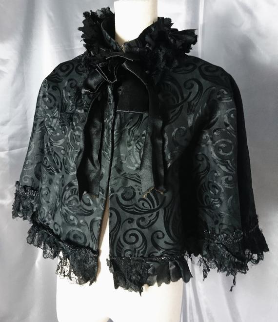 Victorian Antique Mourning Capelet, Black Burnout Silk, Lace, Jet Beading