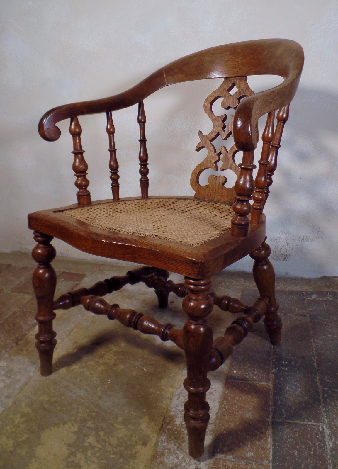 Victorian Antique Oak Scroll Captains Elbow Smoker Bow Chair Cane Bergere Seat (1 of 1)