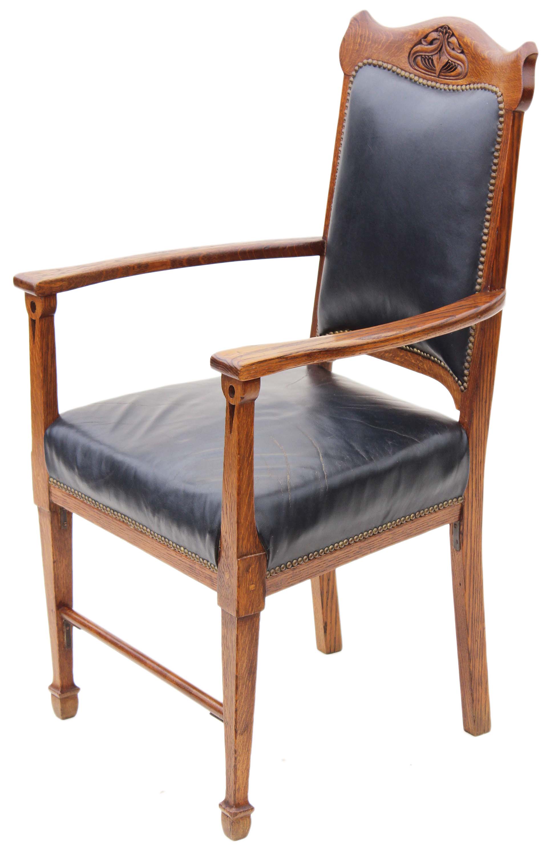 Victorian Arts and Crafts Oak Leather Armchair / Throne Chair / Carver Chair