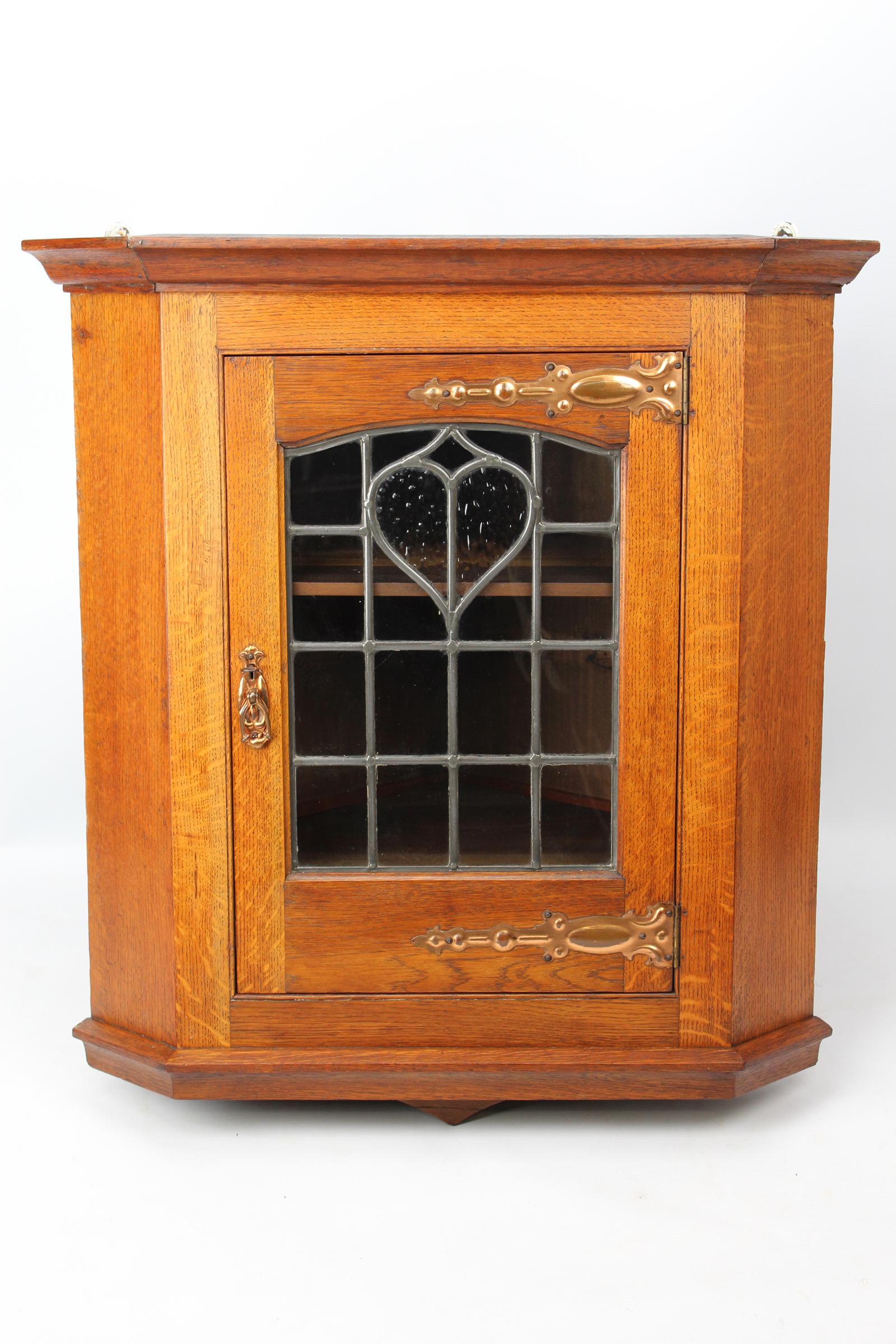 A charming and good quality late Victorian antique Arts & Crafts oak corner cupboard with leaded glass door and copper hinges dating from circa 1898. In attractively figured quarter sawn solid oak, with good warm colour. It has attractive fancy copper hinges and its original copper drop handle to the door which is stamped with the registration number Rd316050 for the year 1898. The leaded glass door with a classic heart shaped motif opens to reveal two shelves. The door locks and comes with a working key. A really good quality, attractive period Arts and Crafts piece in good original condition.