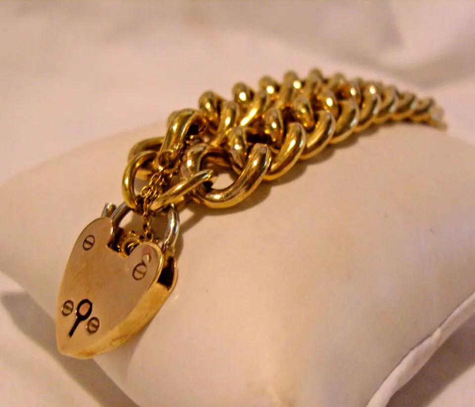 Victorian Bracelet 12ct Rolled Gold 1890s Chunky Curb Link & Love Heart Padlock 8"L