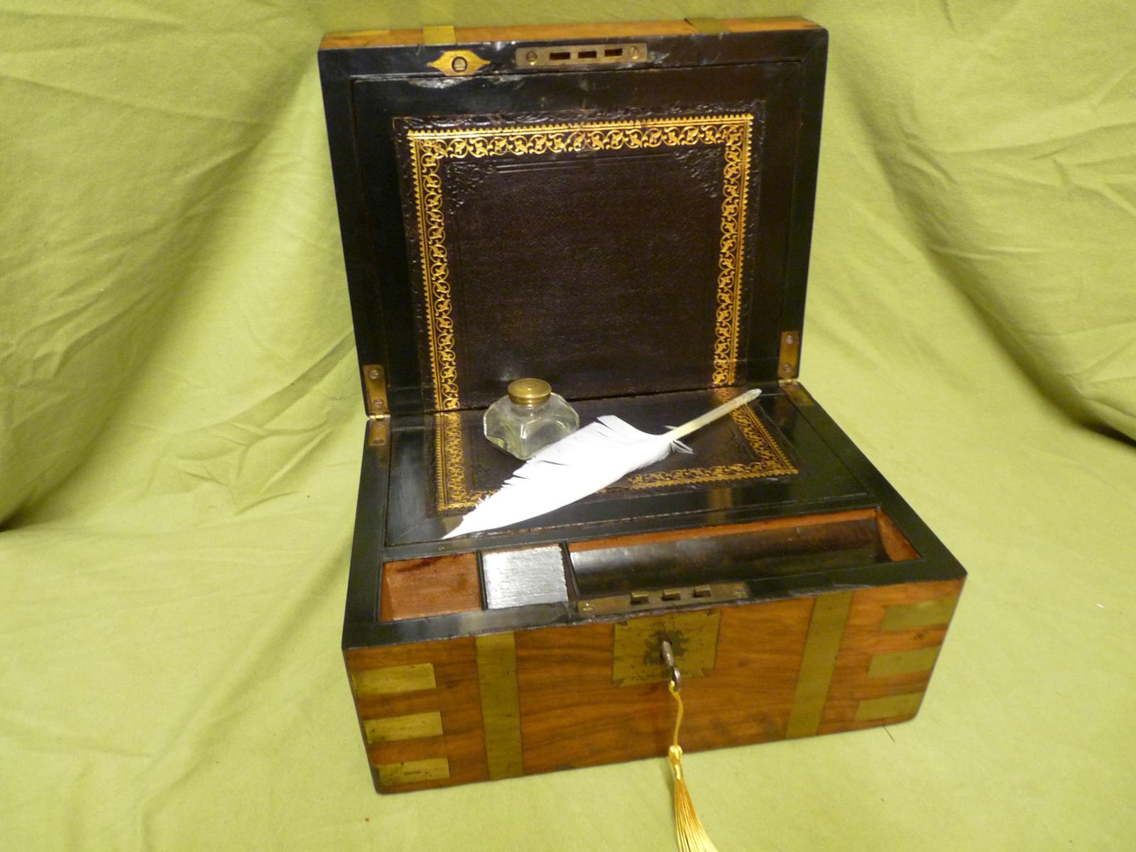 Victorian Brass Bound Walnut Writing Box - Secret Drawers - Original Leather c.1865
