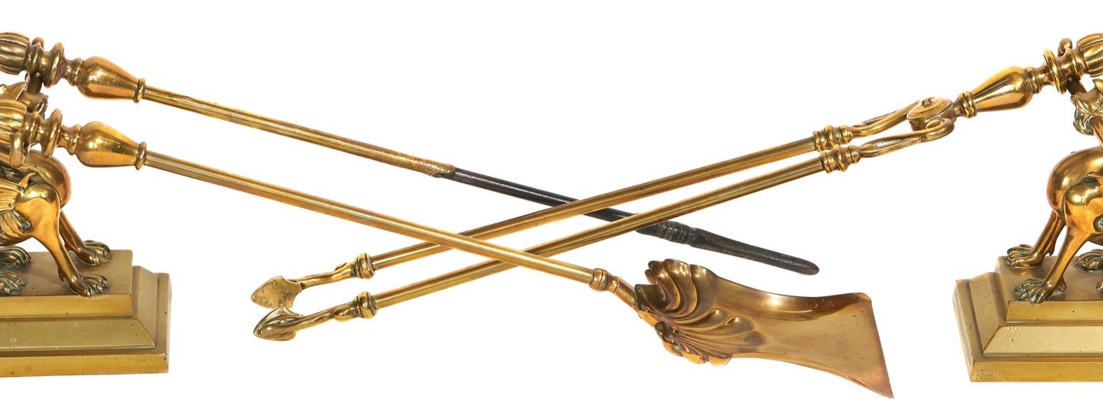 Victorian Brass Fire Irons with Pair of Cast Brass Dragon Fire Dogs (1 of 4)
