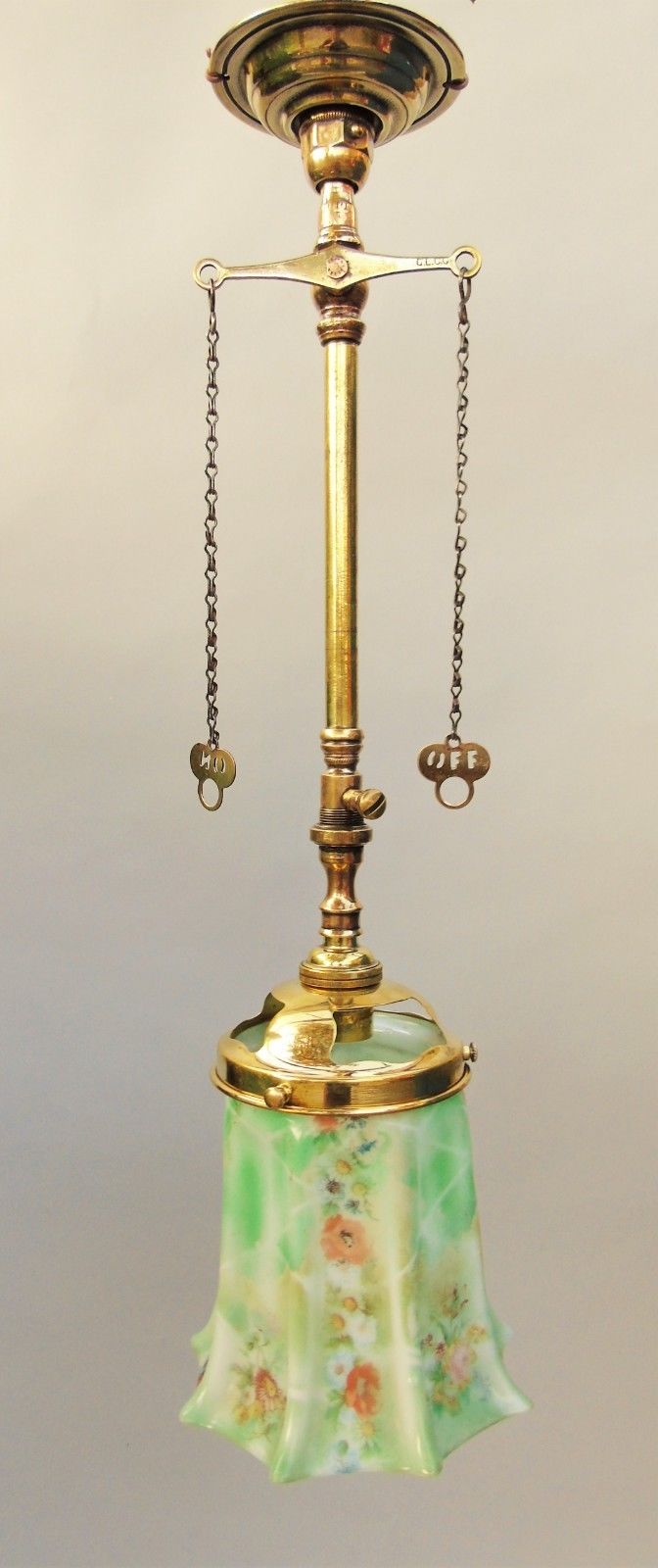 Victorian Brass Gasolier Chandelier Pretty Green Glass Shade