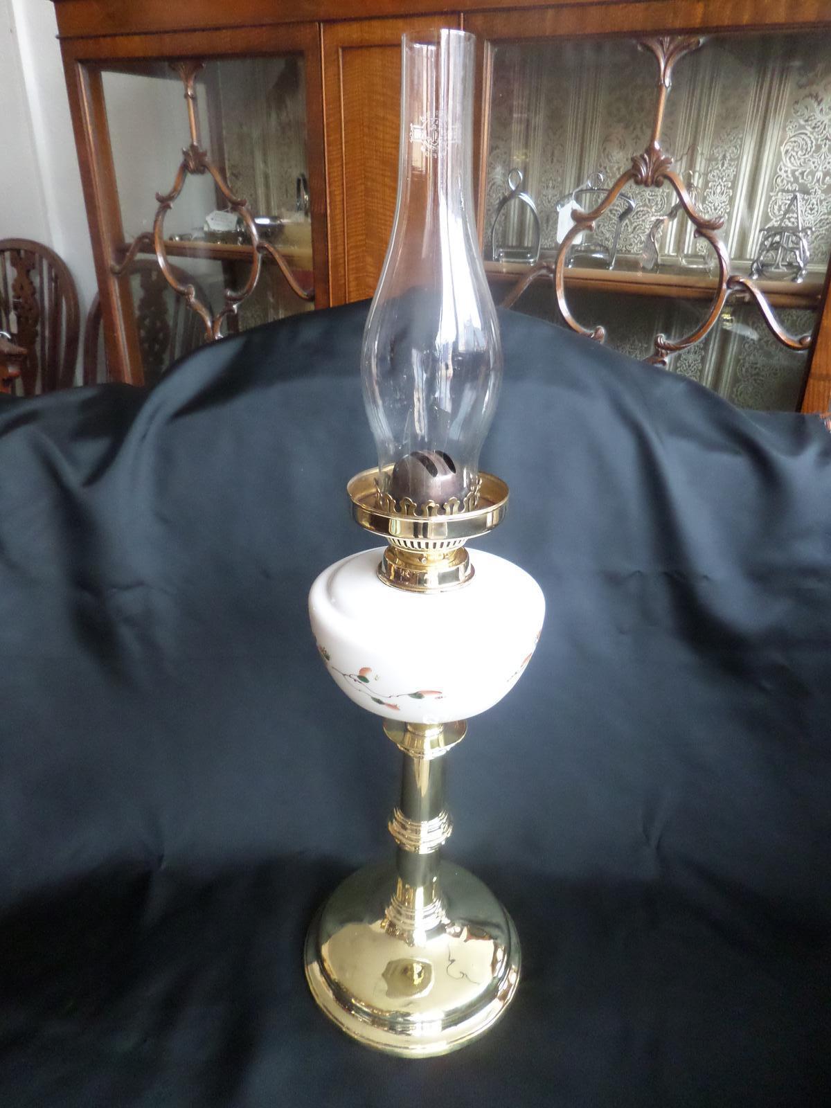 Victorian Brass Oil Lamp with Hand Painted Milk Glass Reservoir & Chimney