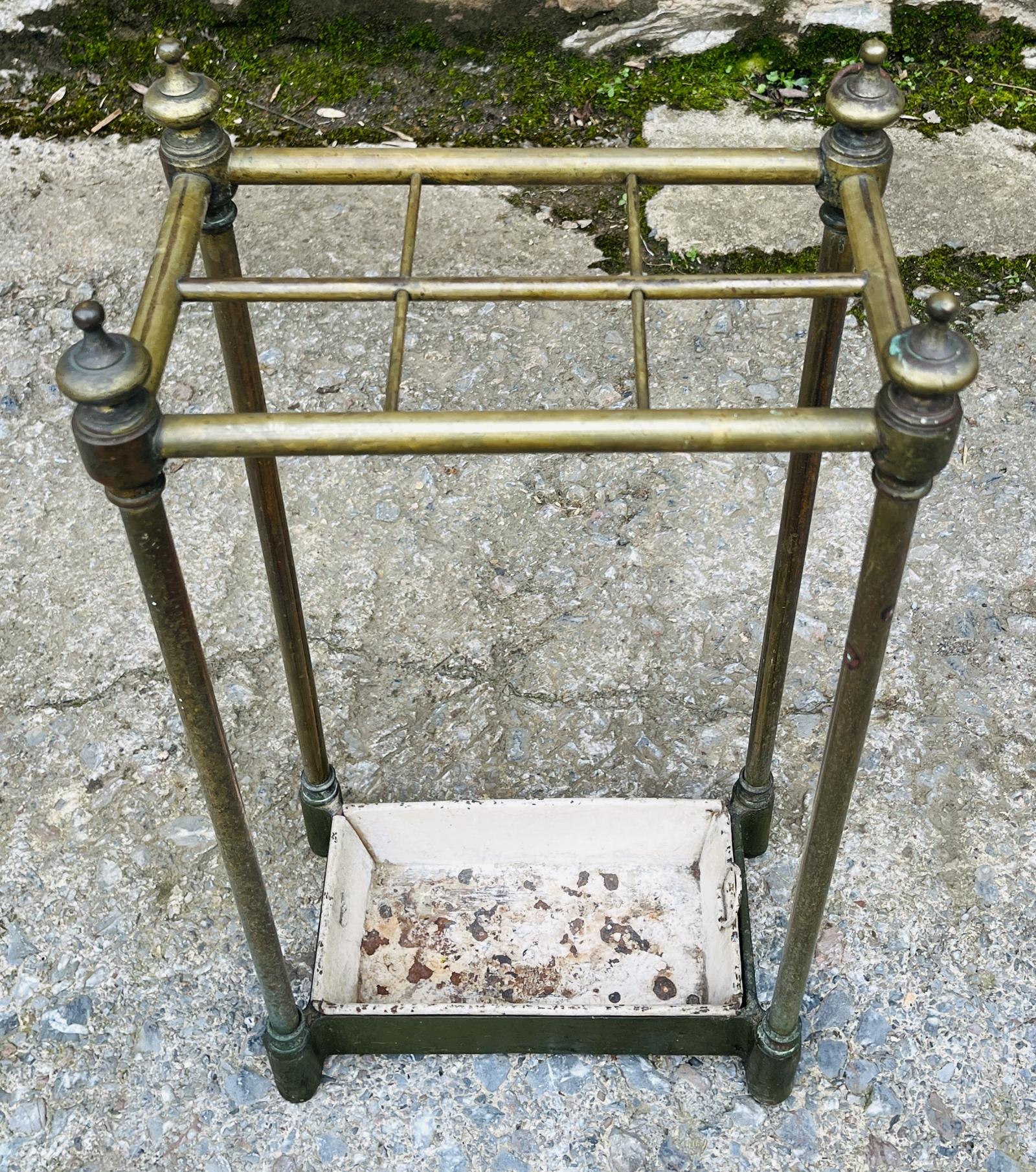 A good quality brass stick stand dating from the late 19th / early 20th Century. It has a tubular brass frame with decorative finials and six divisions. It comes with its original painted metal drip tray.
