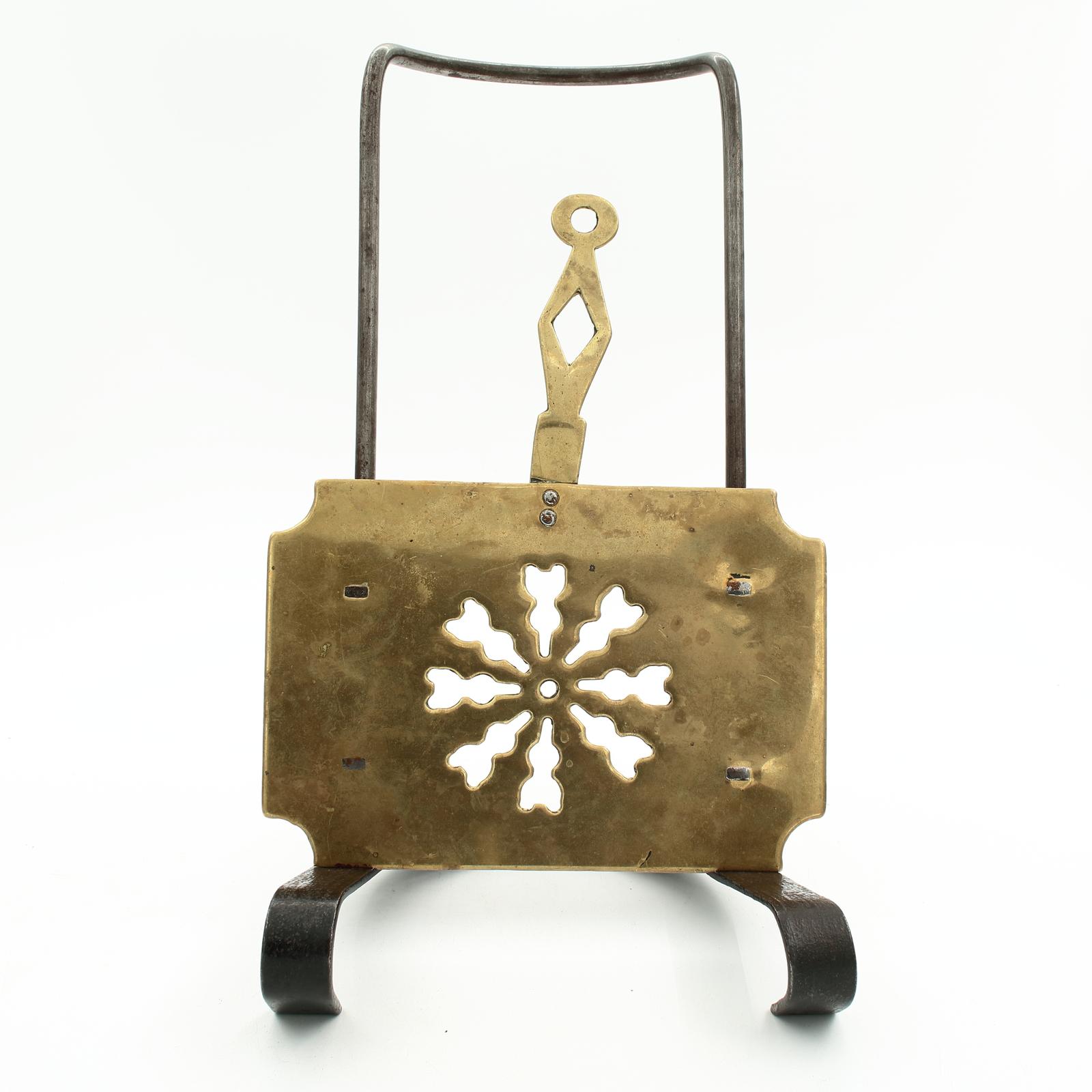 A good Victorian English brass and iron kettle stand or trivet. The wrought iron frame designed to hook onto the bars of the fire grate or range, while the adjustable decorative pierced brass plate, on which the pot or kettle would be placed, could be moved back and forth as required.