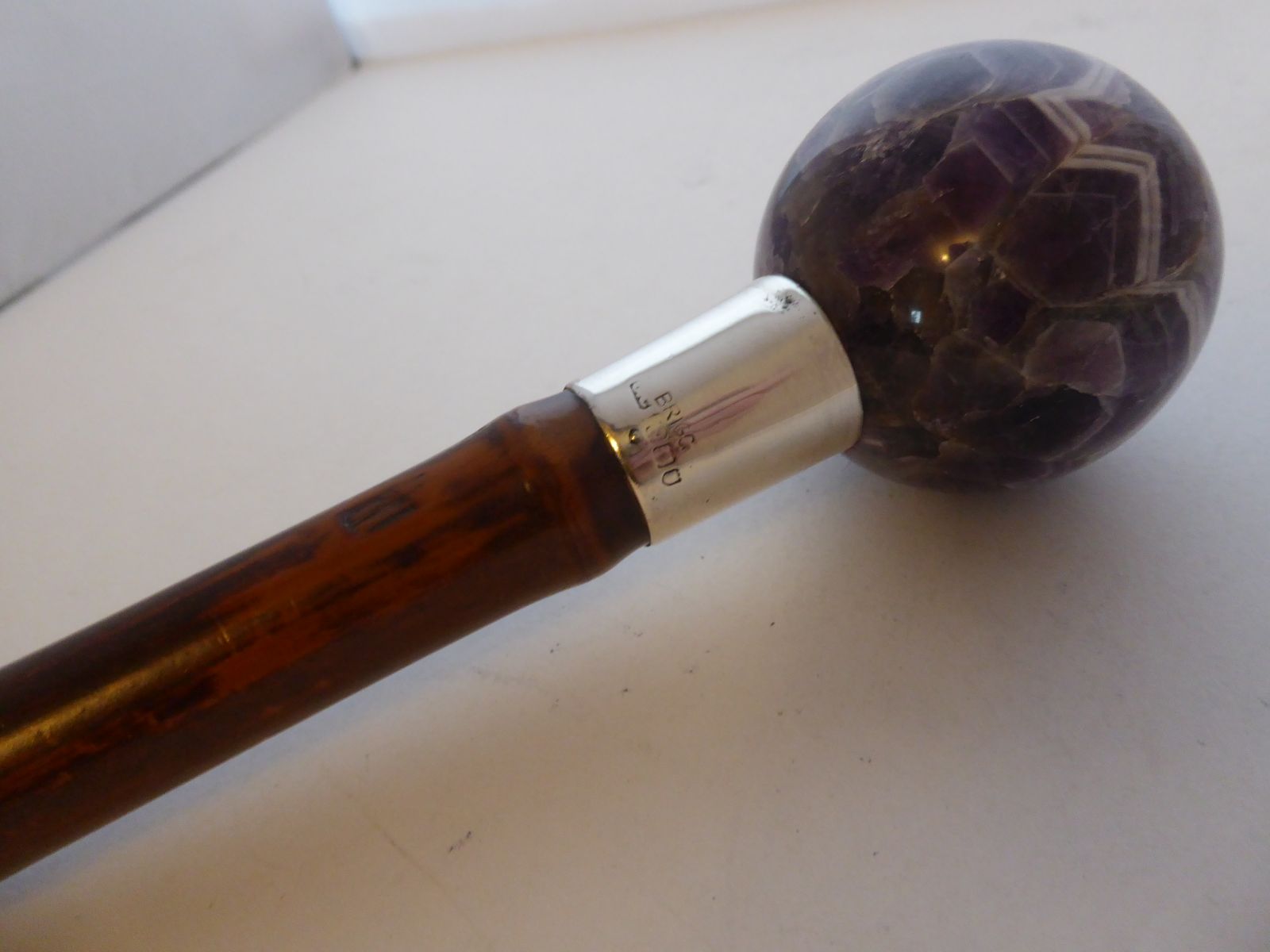 Victorian Brigg Walking Stick Cane Amethyst Ball Silver Collar Bamboo Shaft