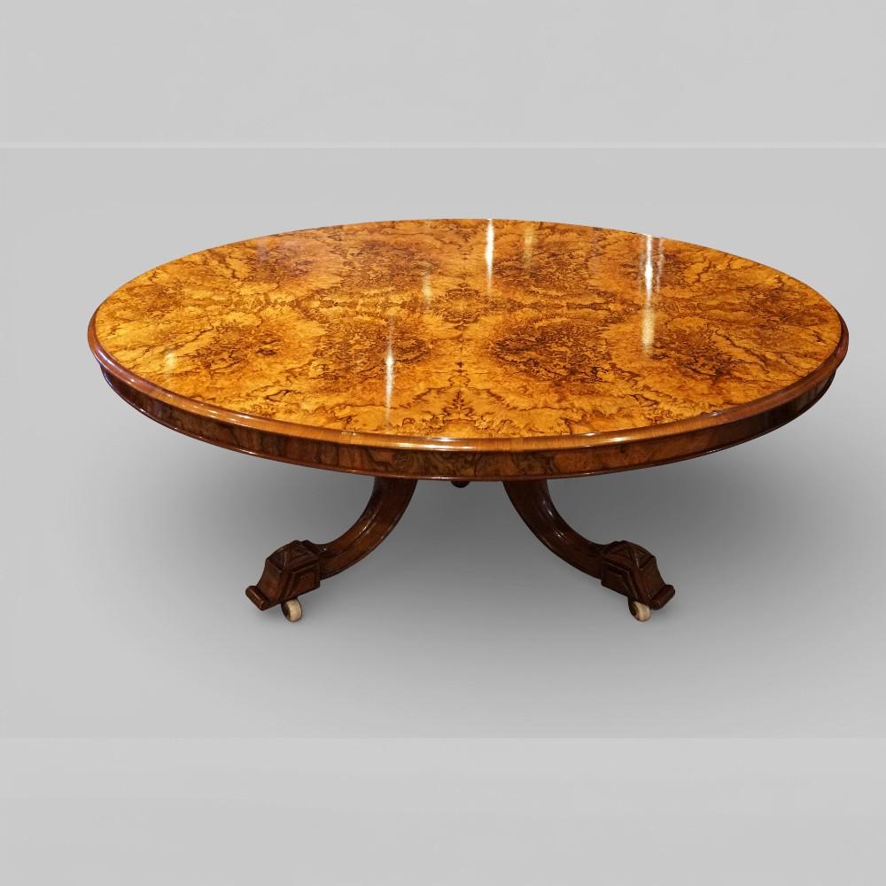 The top is supported by a robust and elegant twin-end pedestal base, with sweeping curved supports terminating in carved feet fitted with original-style castors. The scale and quality of the burr walnut veneers reflect the Victorian taste for statement furniture, making this table both highly decorative and eminently practical.
