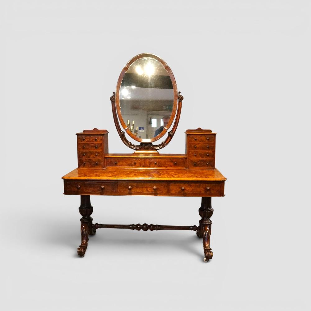 Victorian Burr Walnut Dressing Table with Adjustable Mirror and Trinket Drawers