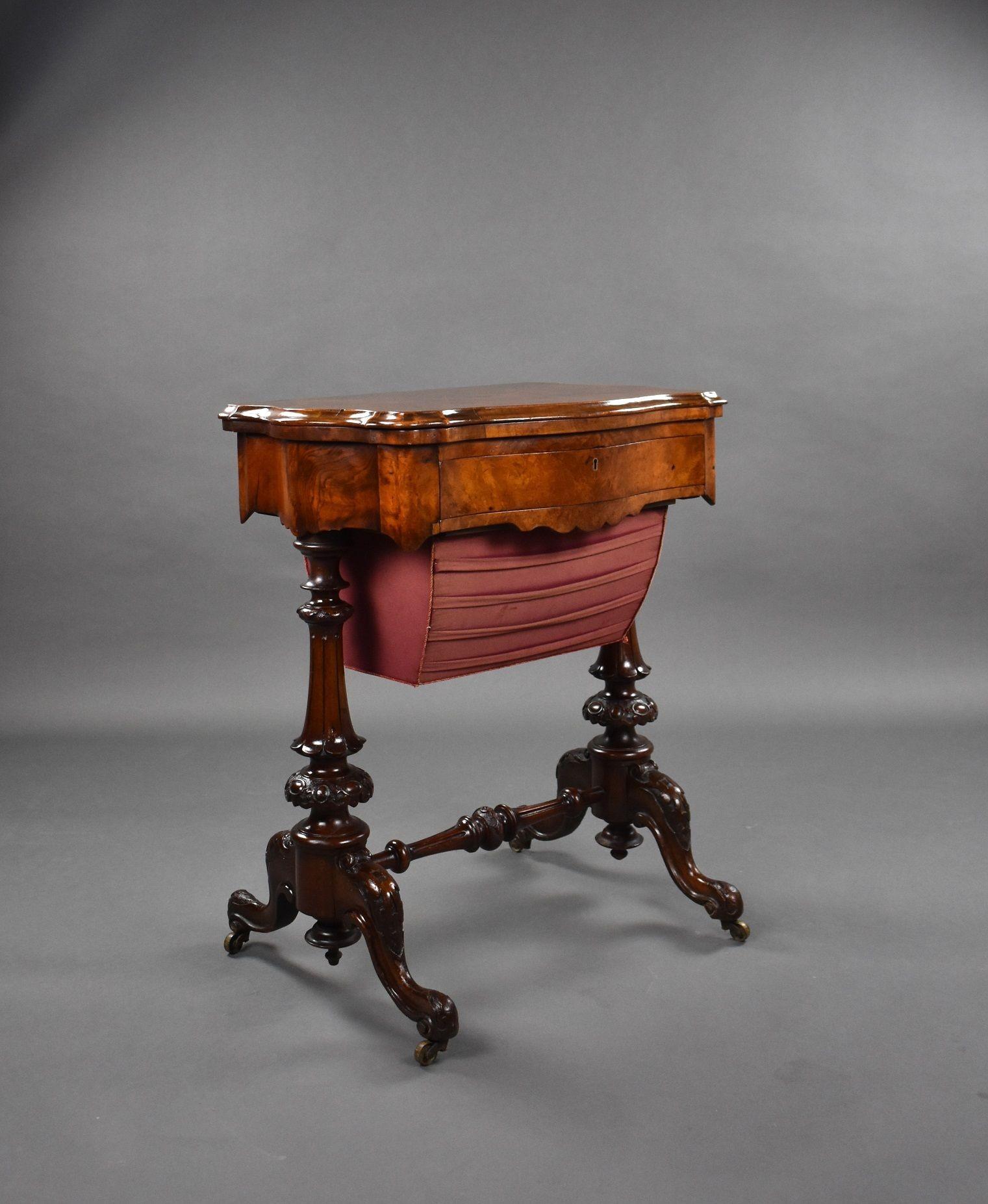 A fine Victorian burr walnut games table, beautifully constructed and richly figured throughout. The shaped rectangular top opens to reveal a fitted interior incorporating a chessboard to one side and a backgammon board to the other, with inlaid counters and scoring details. Beneath, a pleated upholstered fabric basket provides storage for gaming pieces, typical of quality mid-Victorian examples.