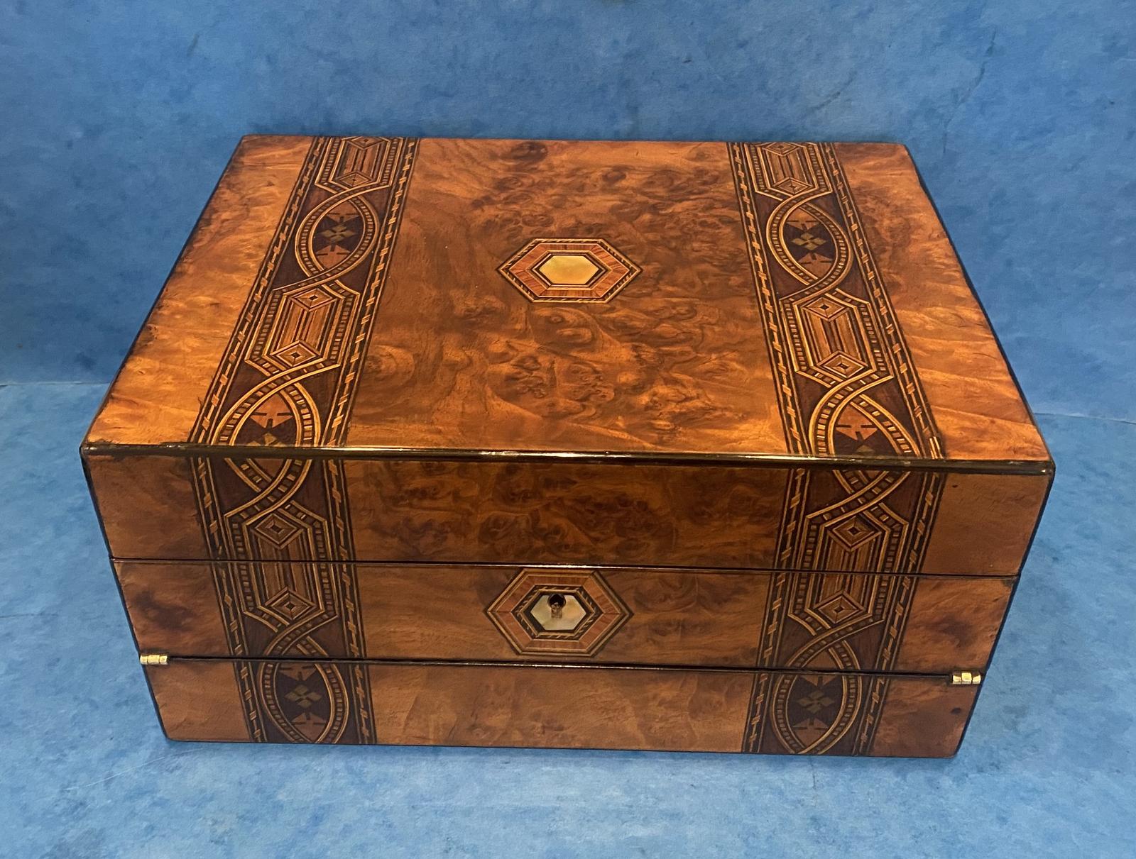 Victorian Burr Walnut Jewellery Box / Writing Slope Featuring Tunbridge Ware Inlaid Bands
