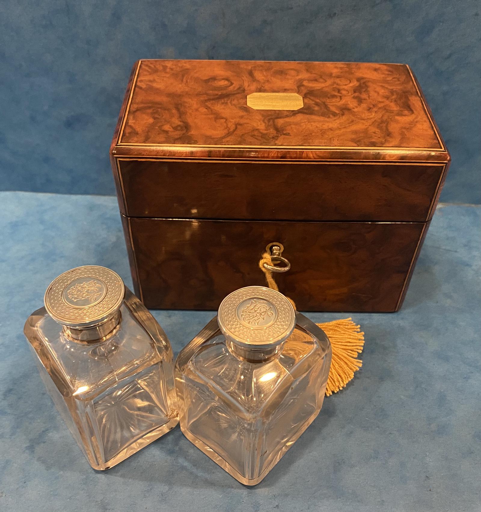 Victorian Burr Walnut Perfumery Featuring Silver Topped Bottles
