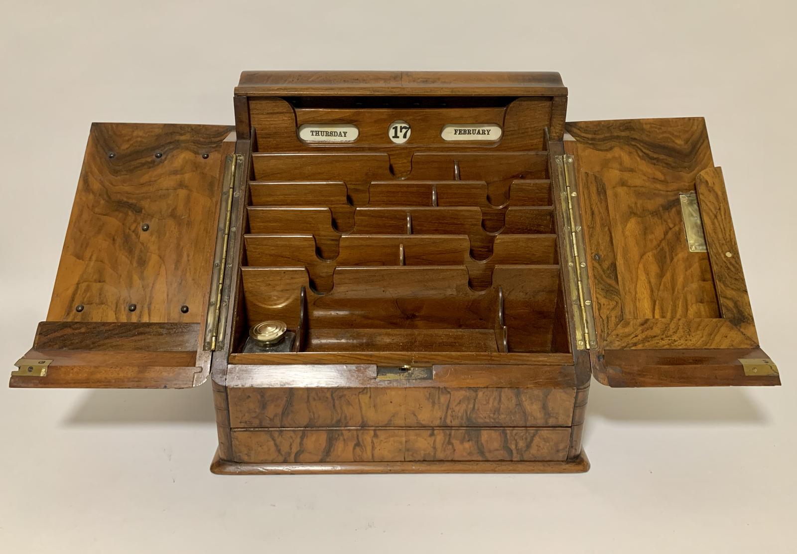 Victorian Burr Walnut Stationery Cabinet with Calendar
