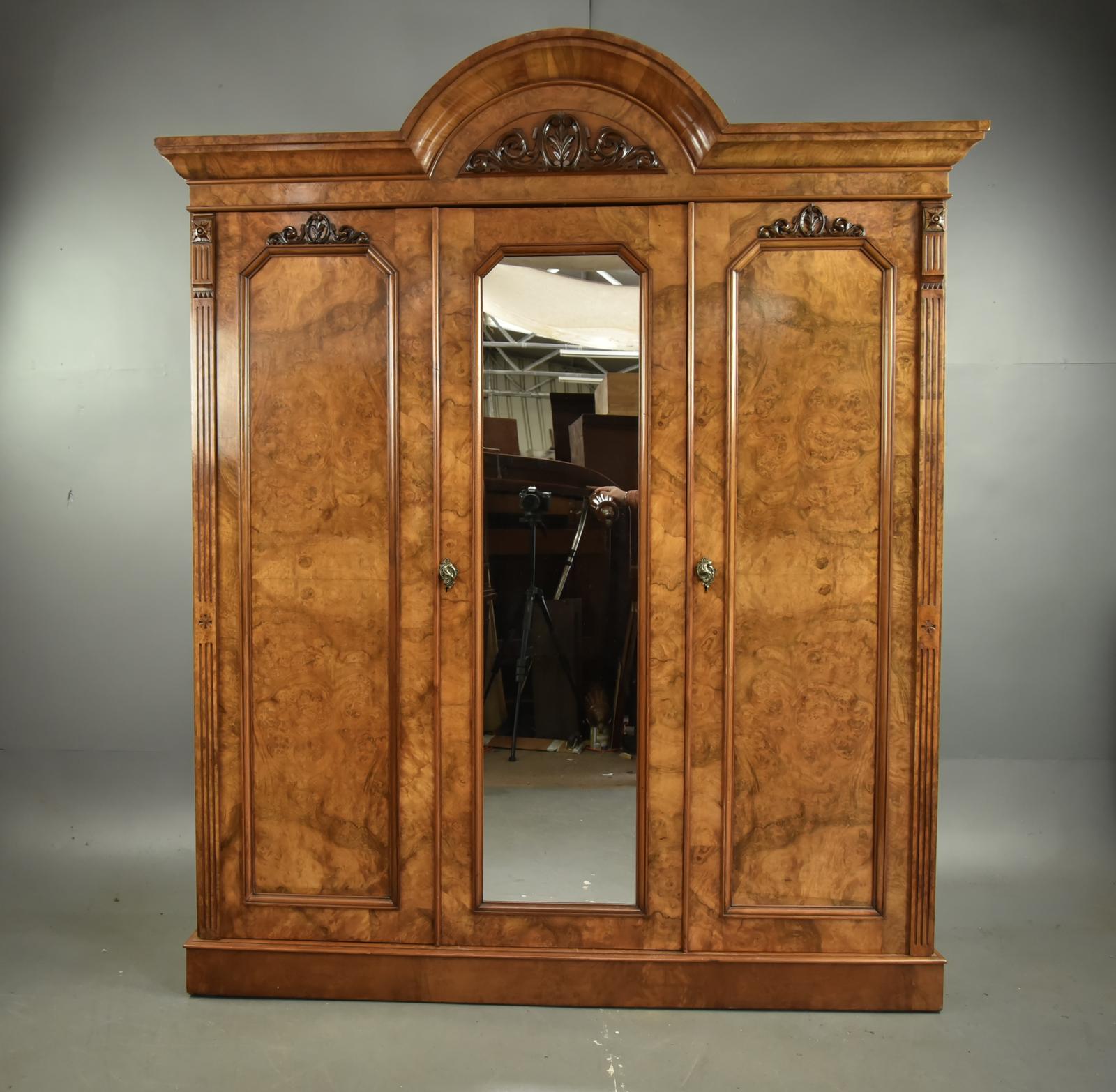 This impressive wardrobe features a shaped cornice with central arched pediment and decorative carved detail, above three doors. The central door has a full-length mirror, flanked by two finely panelled doors with attractive matched walnut veneers.