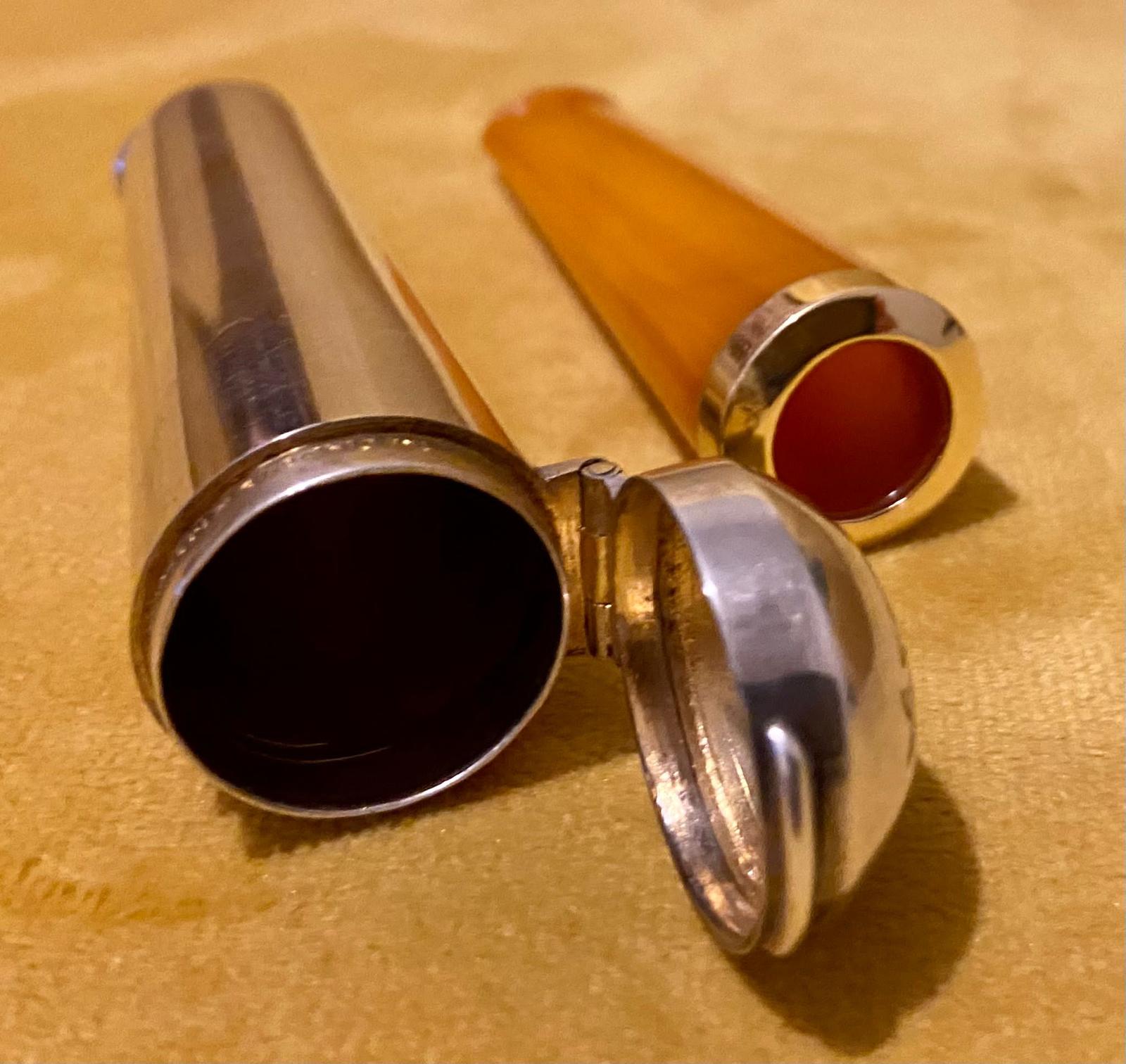 Victorian Butterscotch Amber & 18ct Gold Cheroot Holder with Solid Silver Case Both Hallmarked Samuel Smith Birmingham 1886