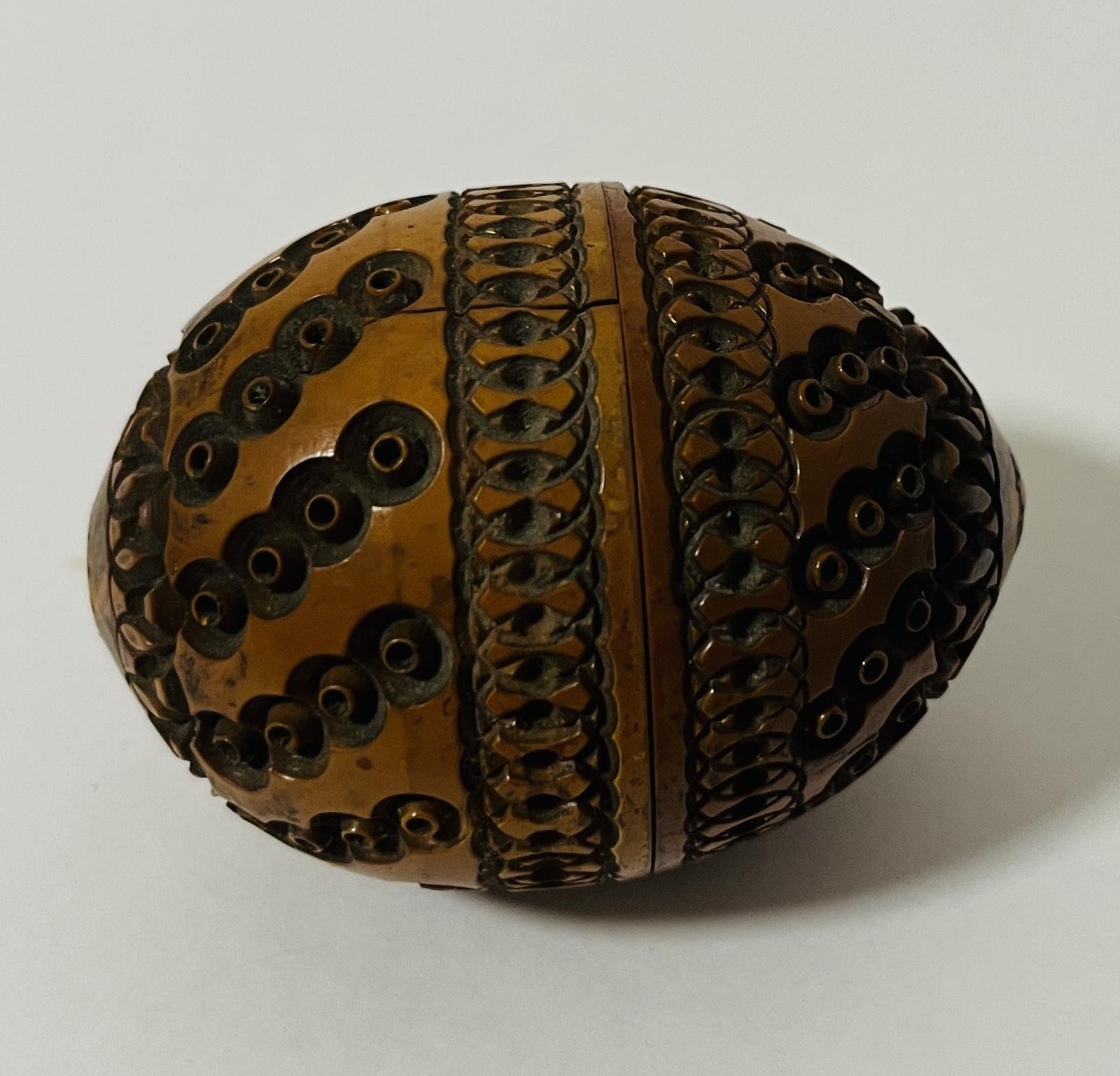 A beautiful carved coquilla nut pomander, modelled as an egg, dating from the 19th Century. It is made in two halves with a threaded join and is ornately carved all over with holes to allow the fragrance out.