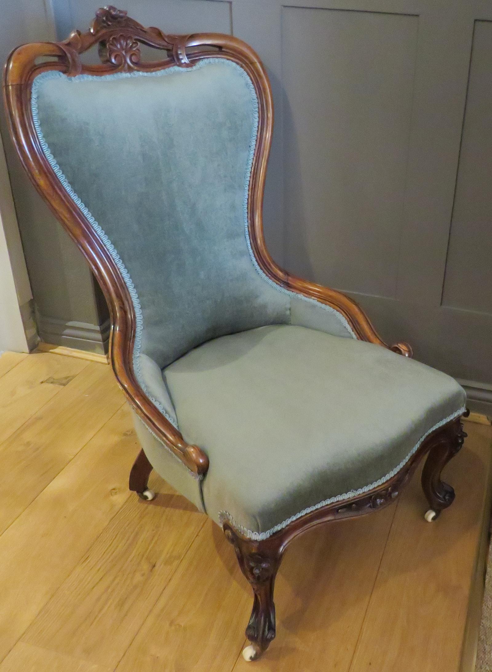 Victorian Carved Ladies Armchair Upholstered in a Blue / Green Velour