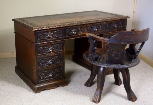 Victorian Carved Oak Writing Desk – 9 Drawers c.1880