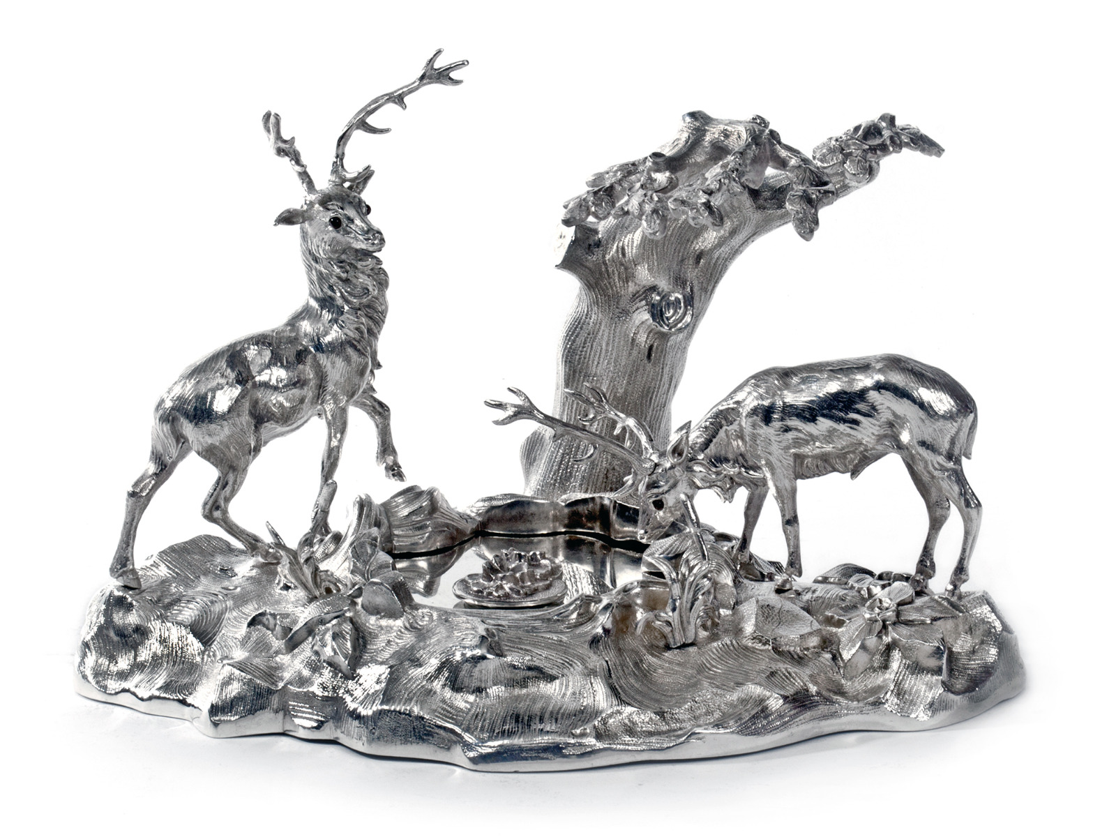 Victorian Cast Silver Plate Ink Stand Depicting Two Stags by a Pond