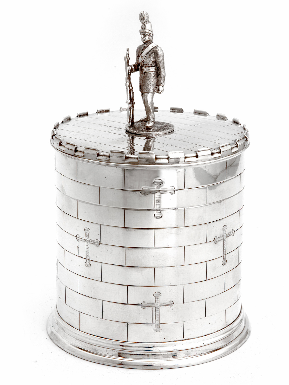 Victorian Castle Shape Silver Plate Biscuit Box with Cast Soldier Figure