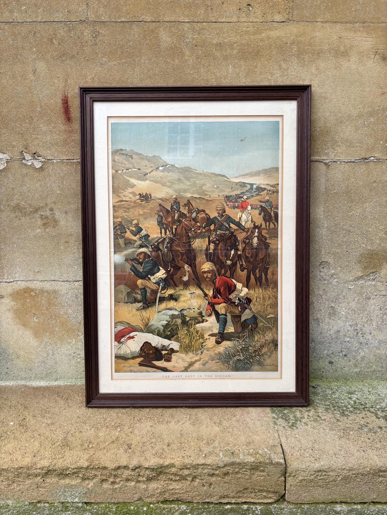 A dramatic and historically significant Victorian military print titled The Last Shot in the Soudan, after the celebrated war artist R. Caton Woodville, depicting a climactic scene from the First Anglo-Sudan War.