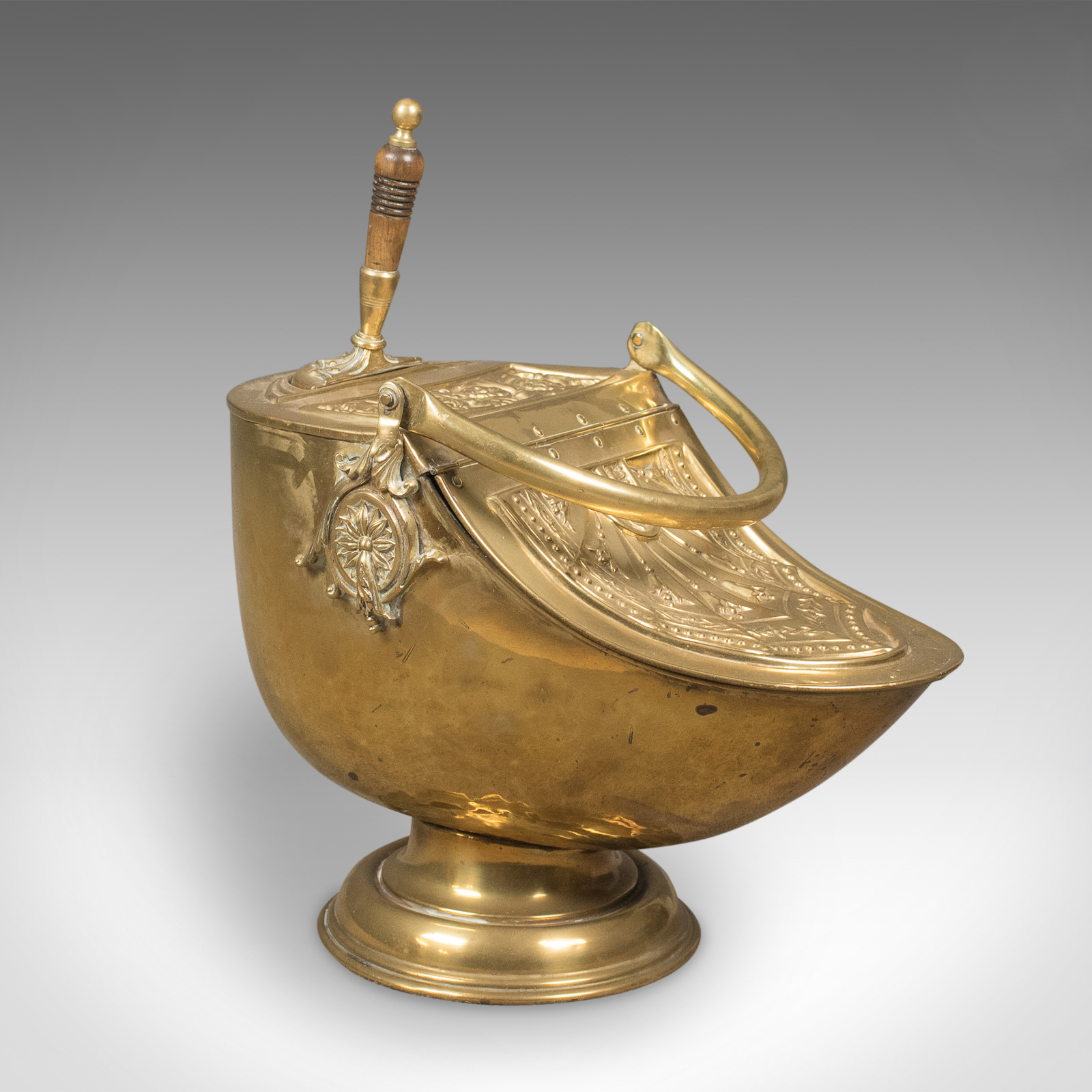 Victorian Coal Scuttle, Brass Fireside Bin with Integral Shovel, English