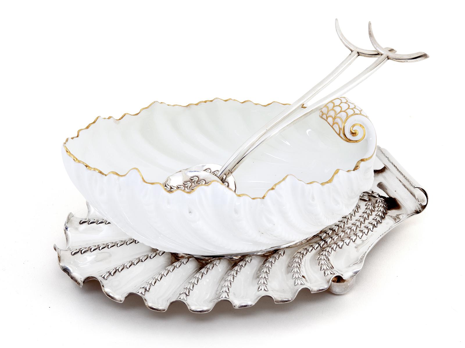 Victorian Coalport Serving Dish on Silver Plate Stand with Original Servers