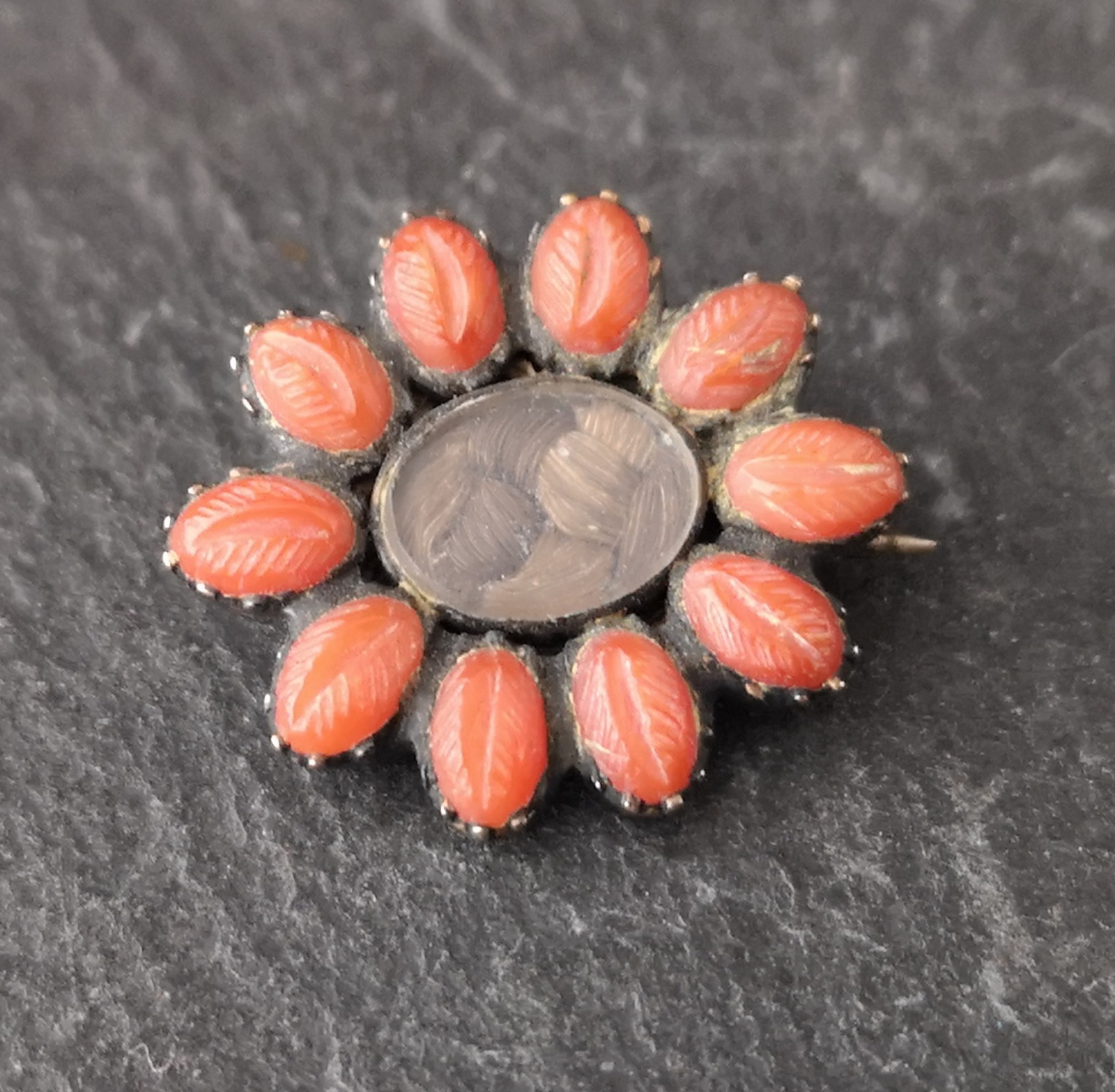Victorian Coral Mourning Brooch, 9ct Gold, Hairwork