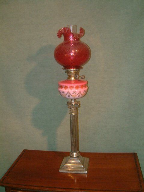 Victorian Cranberry Glass Brass Corinthian Column Oil Lamp