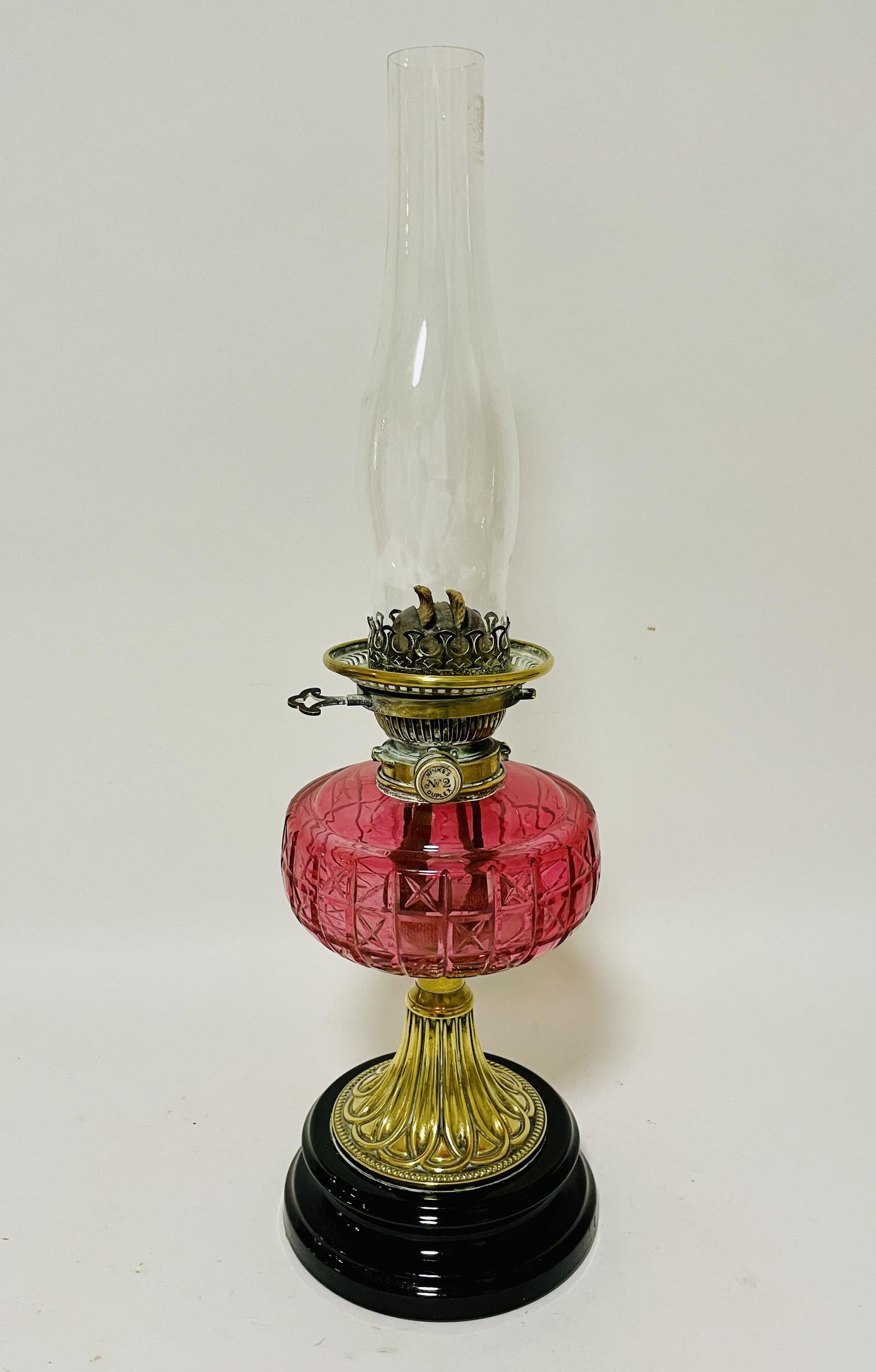 Victorian Cranberry Glass Oil Lamp with Hinks Burner