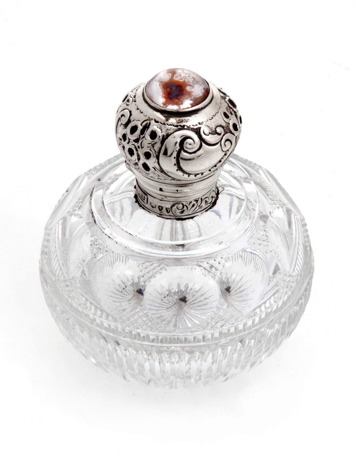 Victorian Cut Glass & Silver Topped Perfume Bottle with Inset Glass Bead (1 of 1)