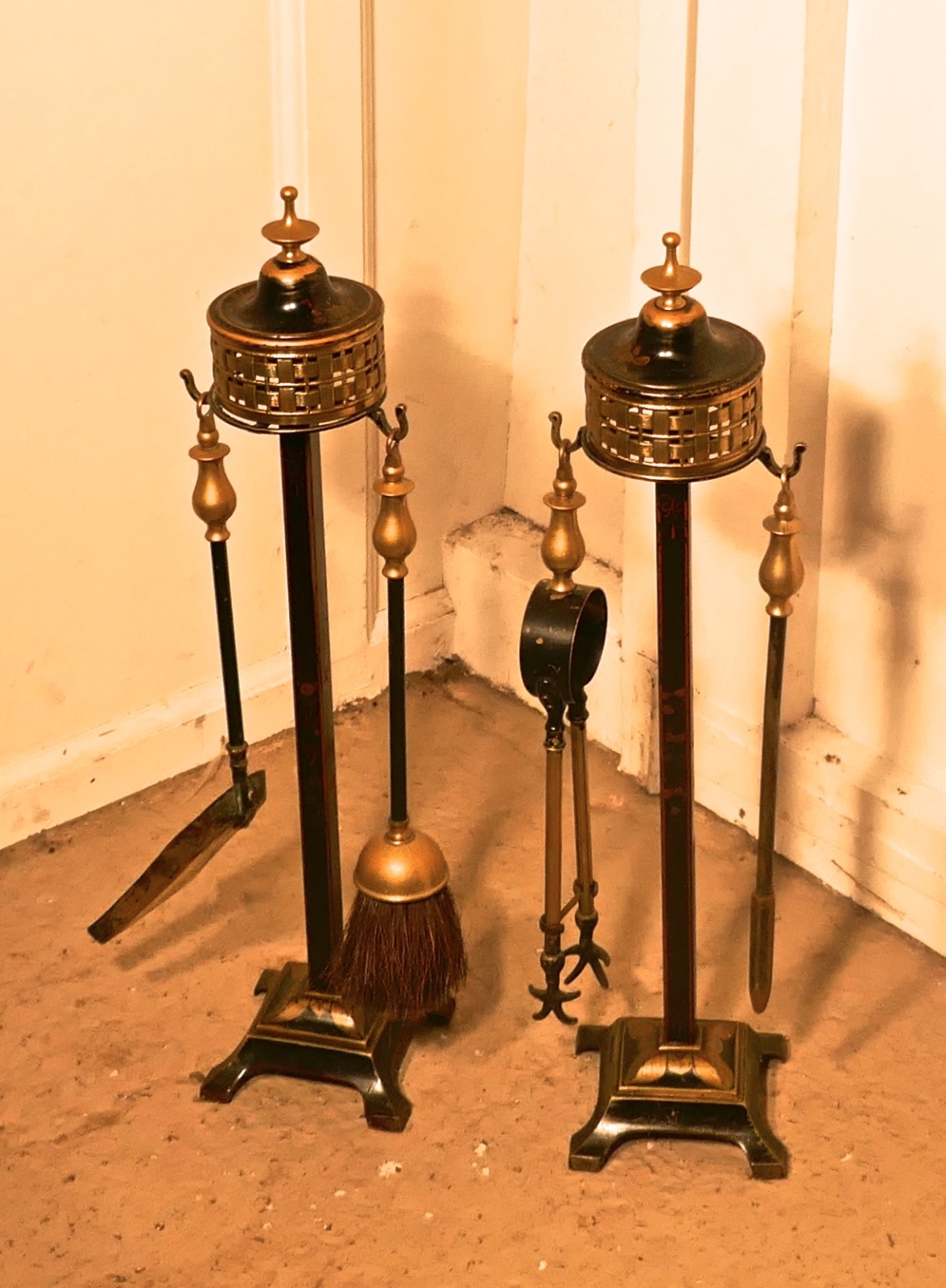 Victorian Decorated Tole Ware Twin Companion Set, Fireside Tools