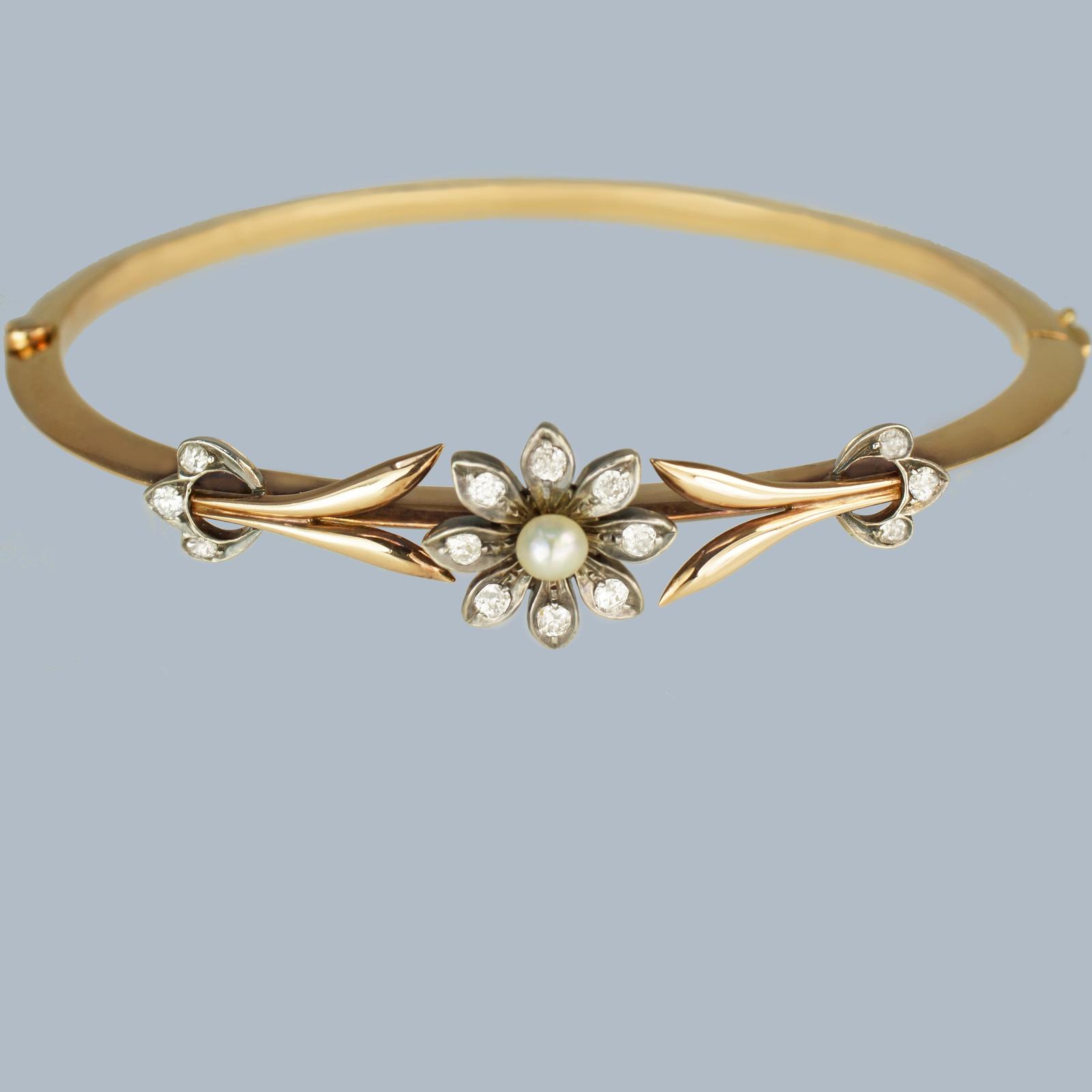 Victorian Diamond and Pearl Bangle 15ct Gold Antique Diamond Floral Bangle Circa 1890