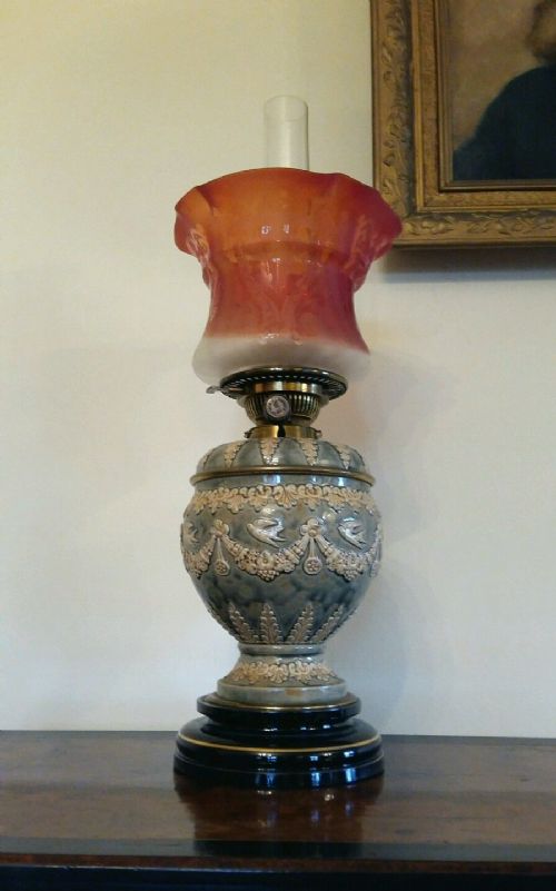 Victorian Doulton Lambeth Hinks Duplex Twin Burner Oil Lamp Cranberry Shade