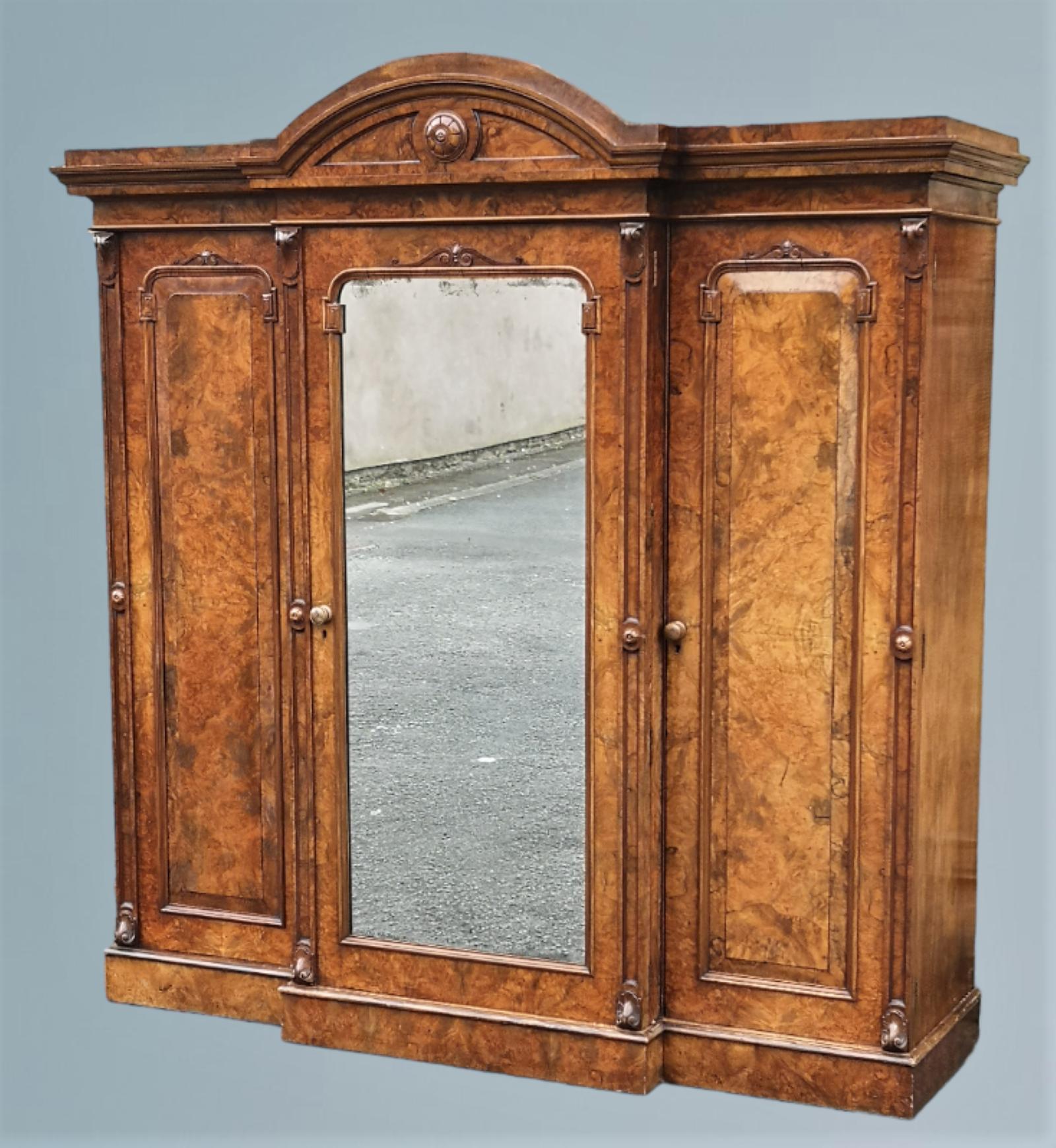 Victorian Figured & Burr Walnut Triple Door Breakfront Wardrobe, Circa 1870