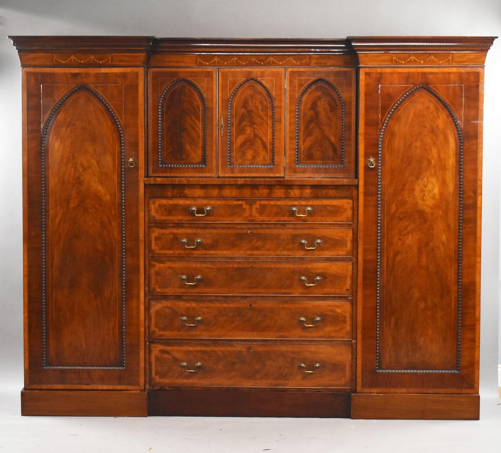 The wardrobe is arranged in a breakfront form, with a central section featuring a bank of graduated drawers beneath a set of panelled cupboard doors, flanked by two full-height hanging compartments. Each door is finely detailed with gothic arch mouldings and subtle line inlay, complemented by elegant decorative inlaid motifs to the frieze.