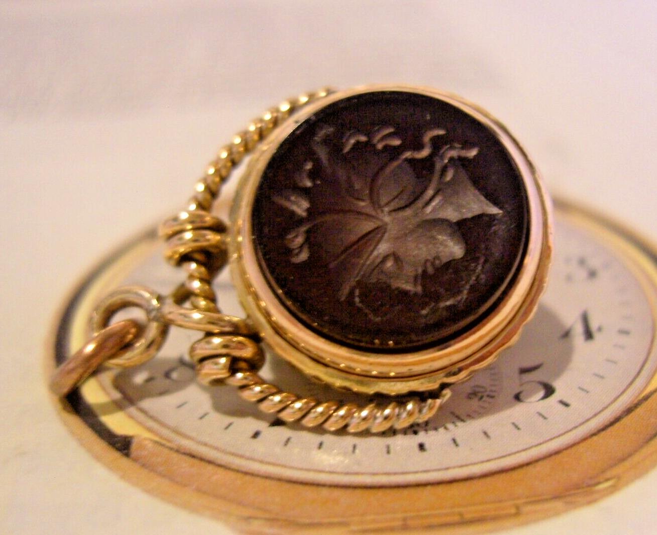 Victorian Fob 12ct Rose Gold Filled Pocket Watch Chain 1890s Antique Intaglio Fob