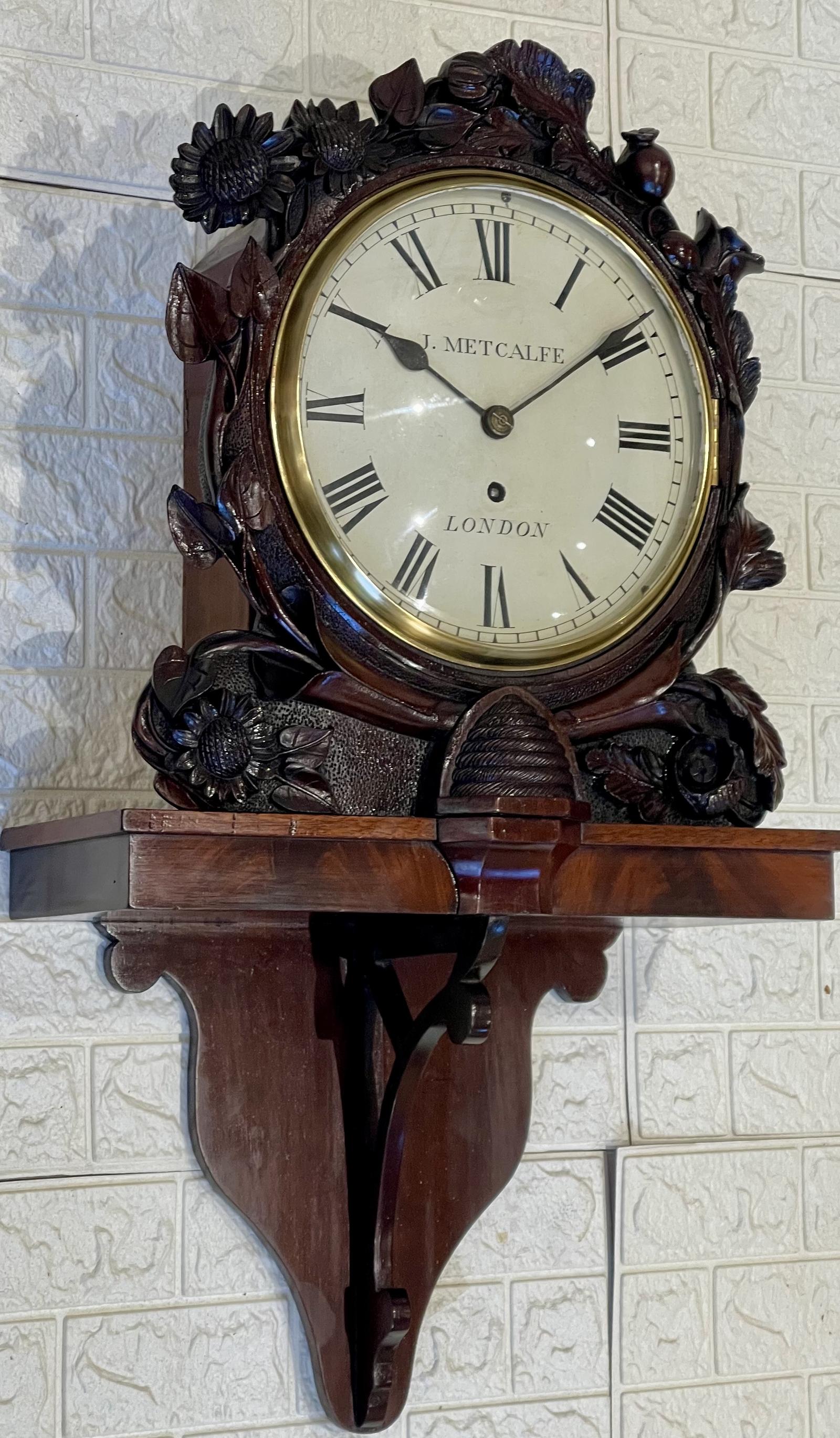 Clockwise is delighted to present for your consideration a fine example of an early Victorian eight day dial fusee wall clock. This unusual mahogany example has an 8 inch dial with 'J. Metcalfe, London' notated to the dial and the clock surround is of a carved foliage design over a fixed bracket with undertier. Original spade hands compliment the appearance as does the original cast brass bezel.