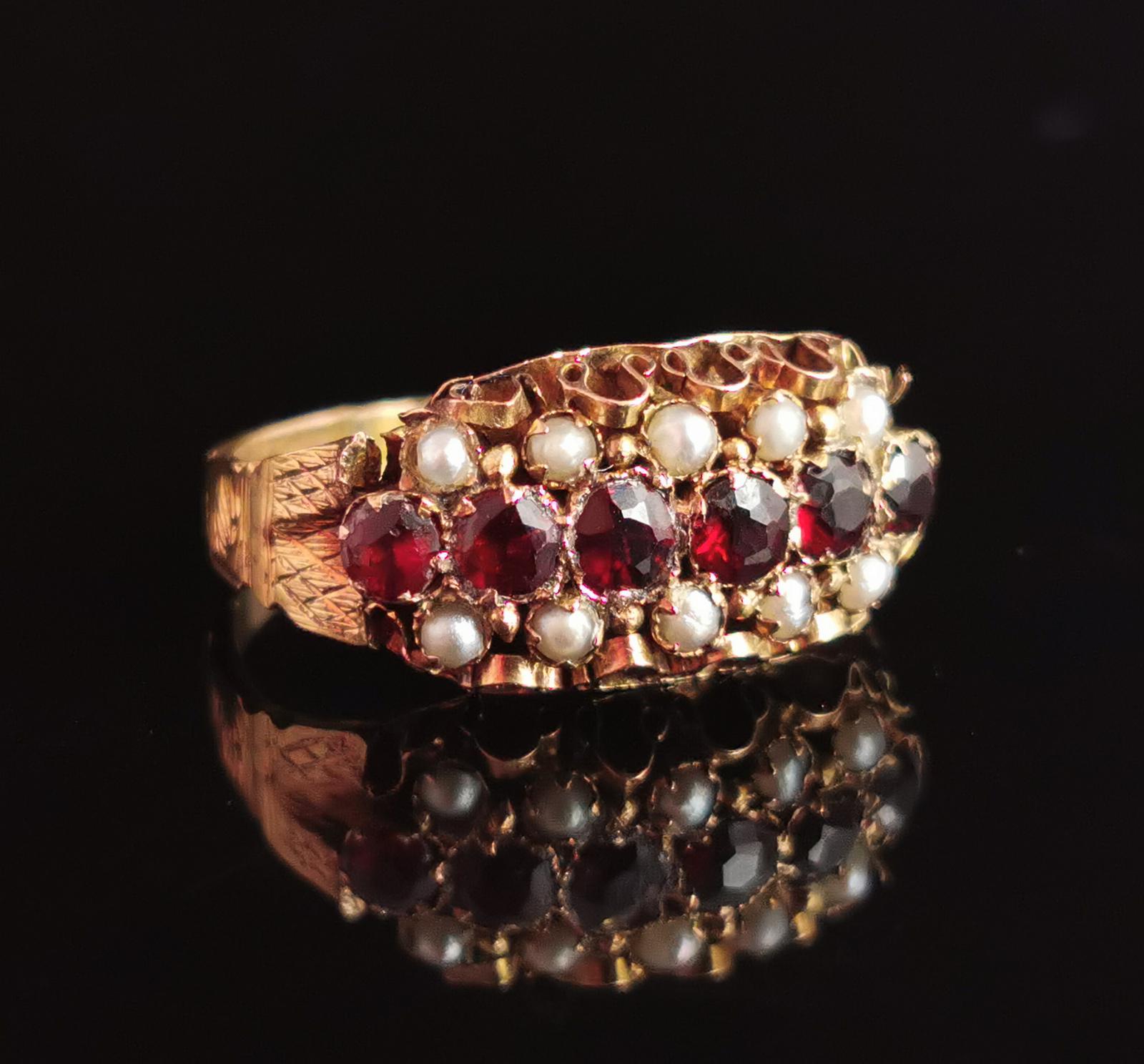 Victorian Garnet and Pearl Ring, 15ct Gold, Engraved Band